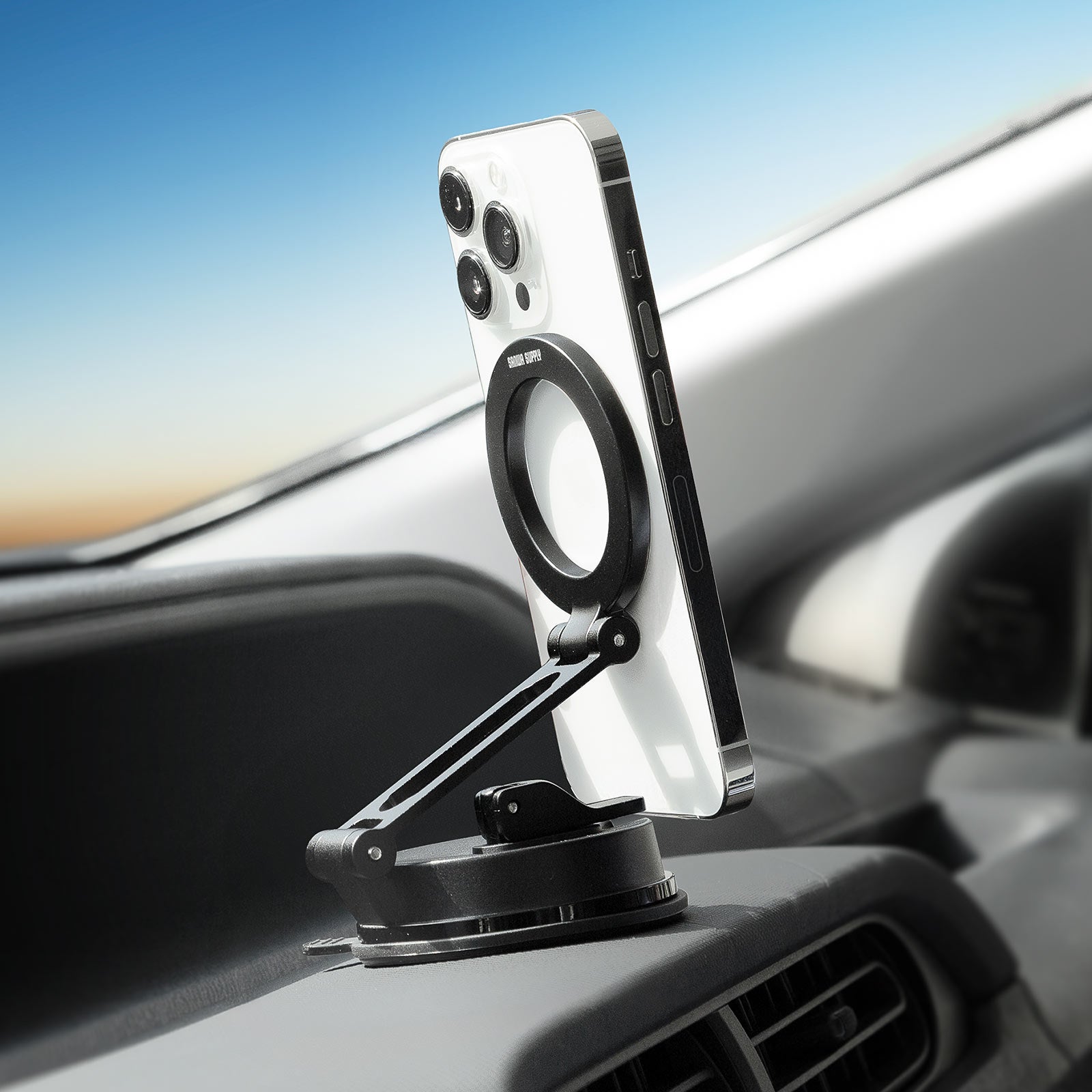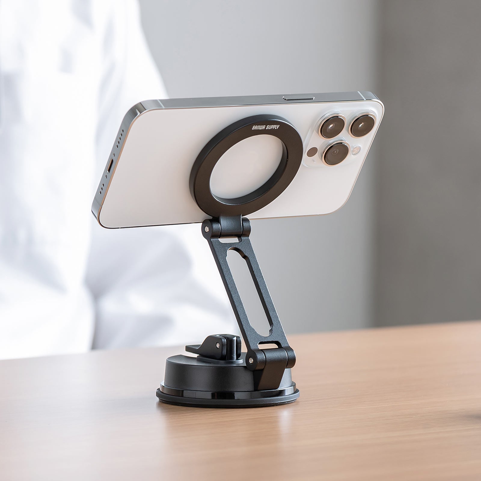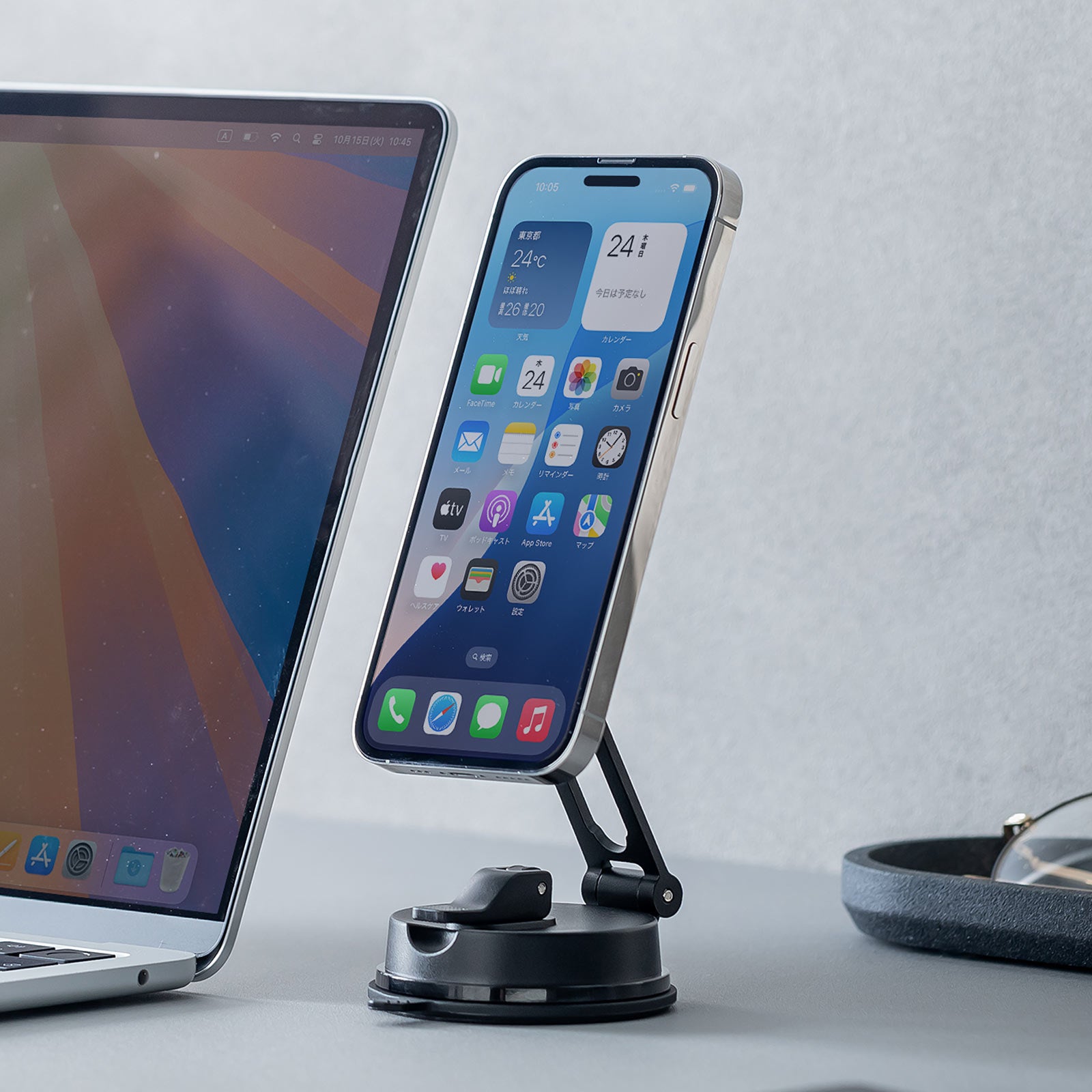 MagSafe対応のスマートフォンが強力マグネットでしっかり固定ができる、吸盤取り付けタイプの車載ホルダー