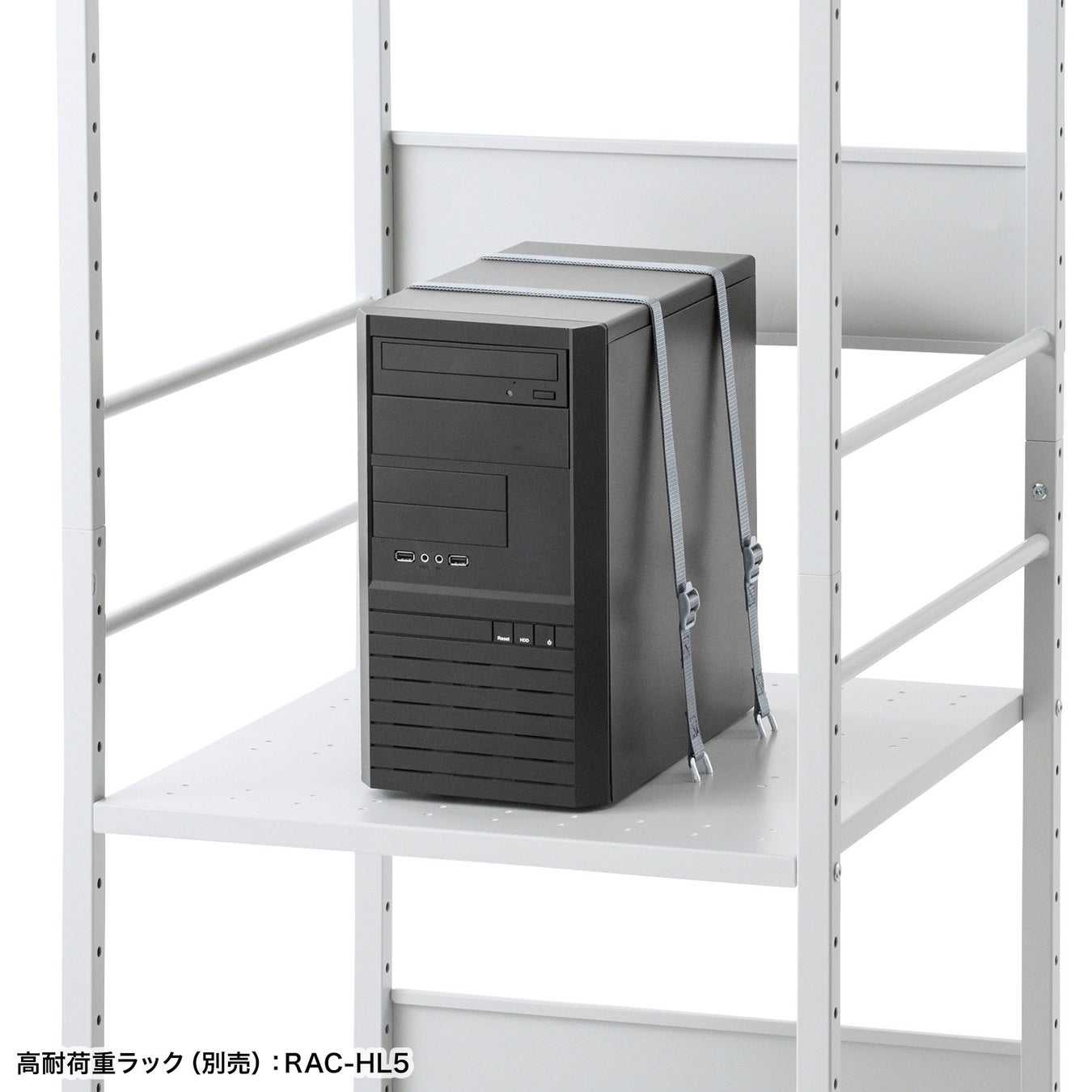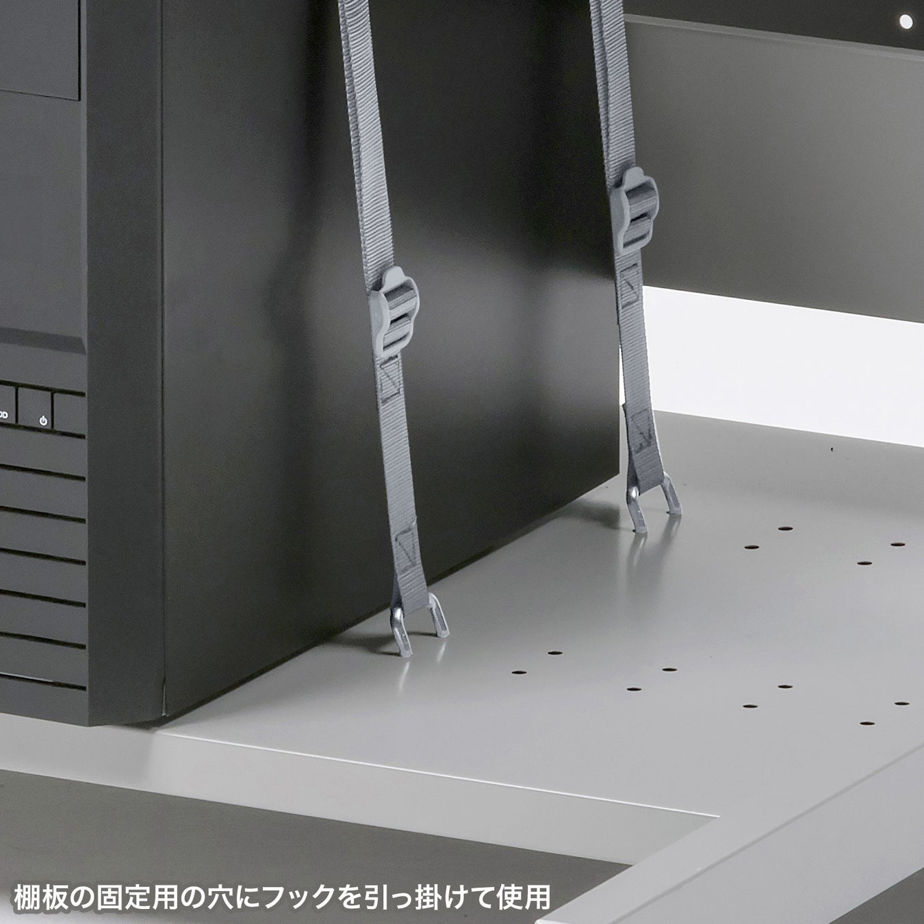 棚板の固定用穴にフックを引っ掛けて、ベルトを締めるだけで簡単に機器を固定することができます。