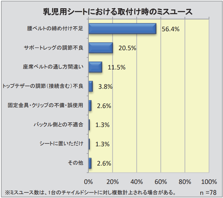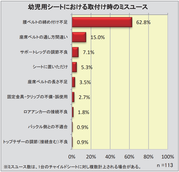 JAFが2023年に実施した「チャイルドシート取り付け状況調査」によると、チャイルドシートが自動車に正しく取り付けられていたのは61.9%。残りの38.1%は腰ベルトの締め付け不足などのミスユースにより、正しく取り付けられていないことが判明しました。チャイルドシートが正しく固定・使用されていないと、万が一の交通事故や急ブレーキの時に思わぬ怪我を負わせてしまう危険性があります。