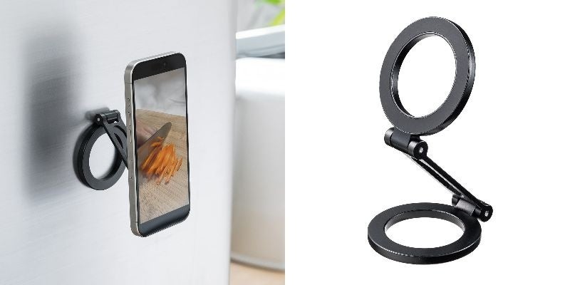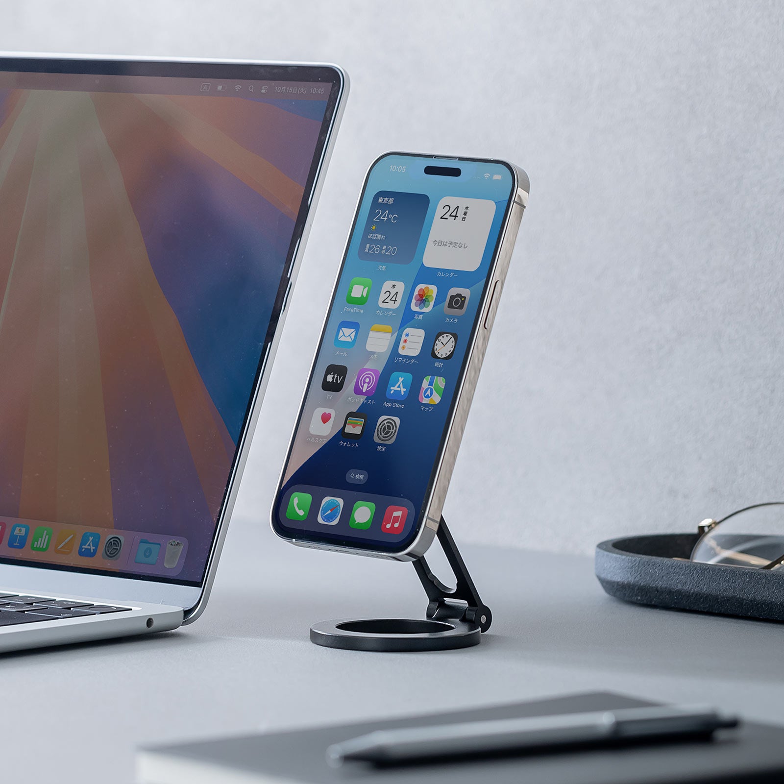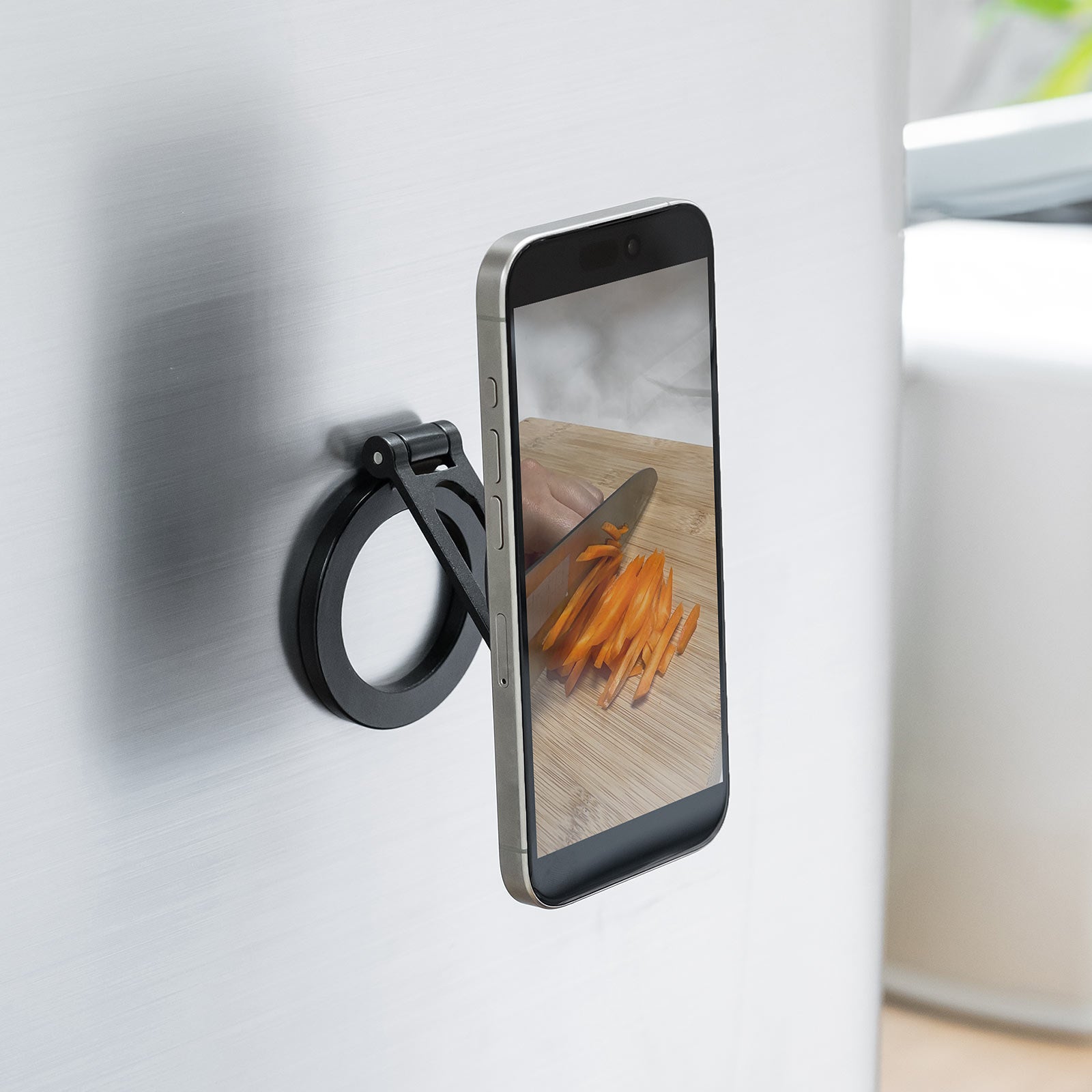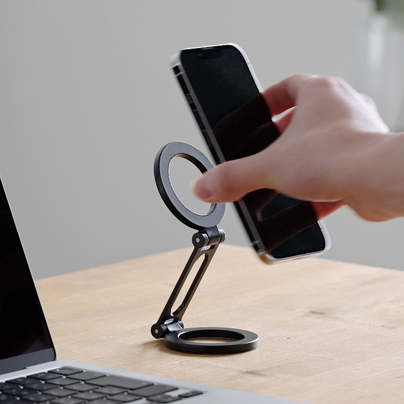 MagSafe対応のiPhoneをワンタッチで装着・取り外し可能な両面マグネットスタンドが登場!固定部分もマグネット式のため、冷蔵庫や金属フレームなど、磁力のある場所ならどこでもピタッと吸着。