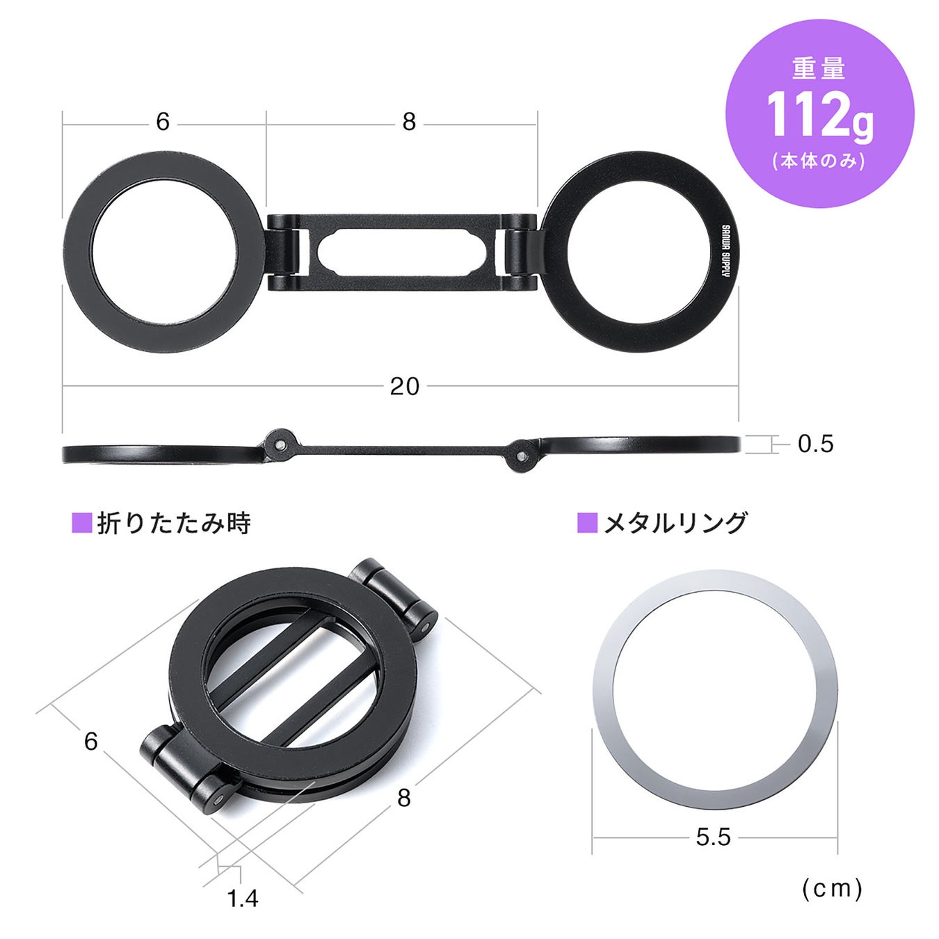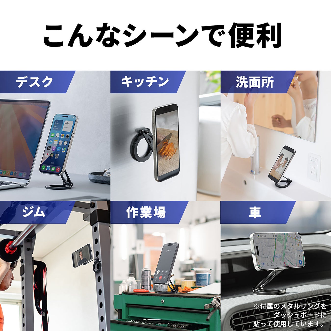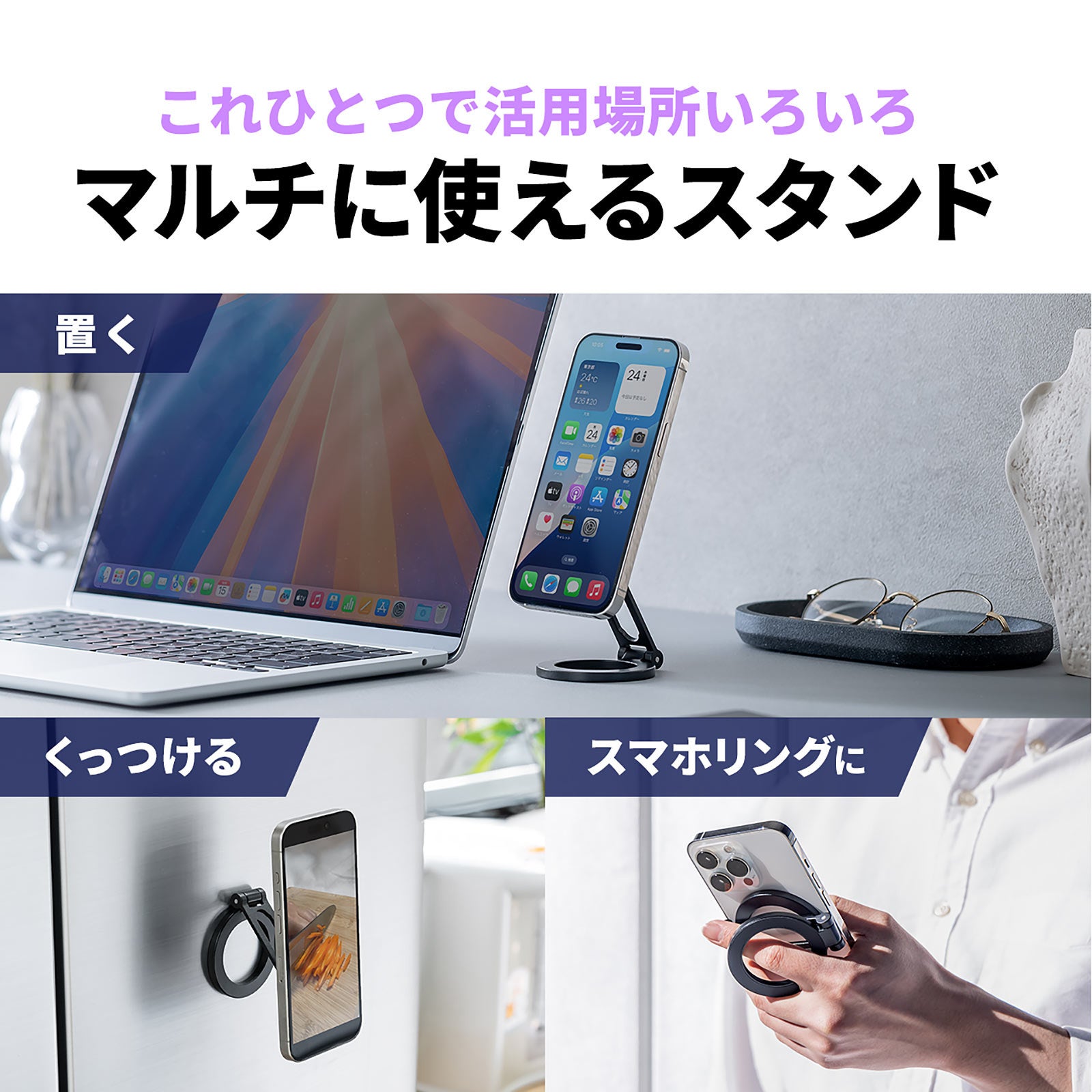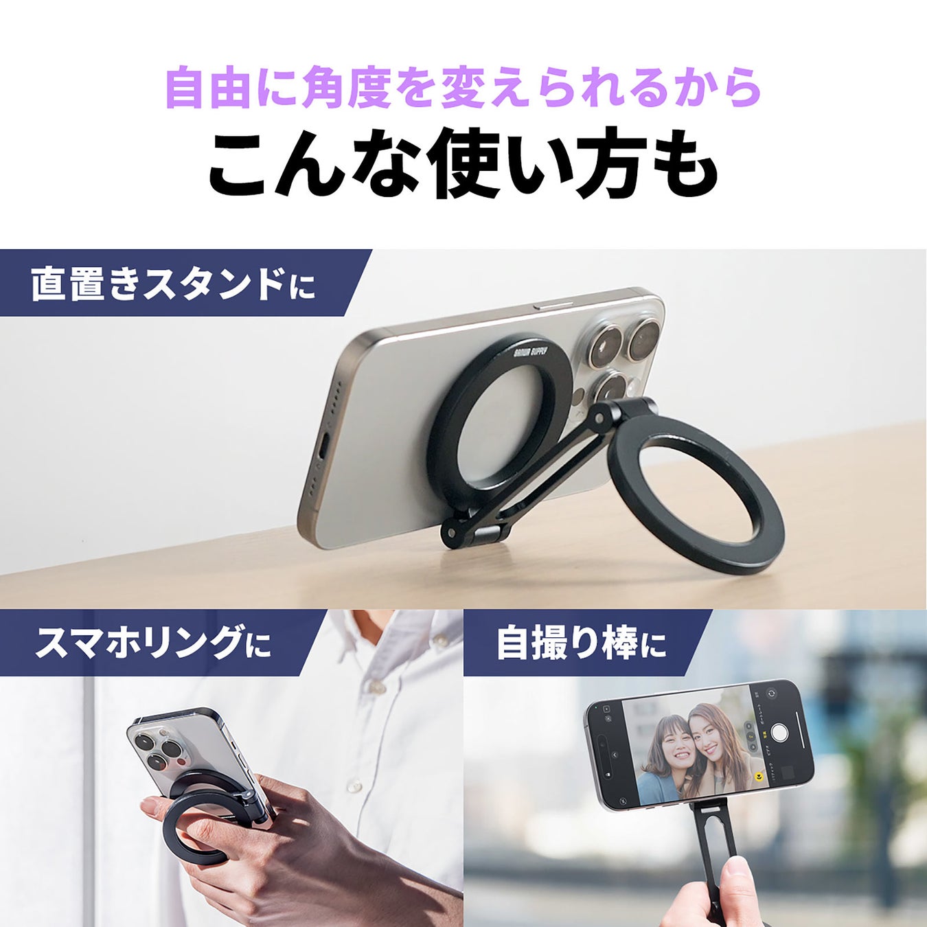 MagSafe対応スマホスタンド 両面マグネット 携帯リング 折りたたみ スマホホルダー 360度調整 片手操作 磁気吸着 iPhone Android メタルリング付属