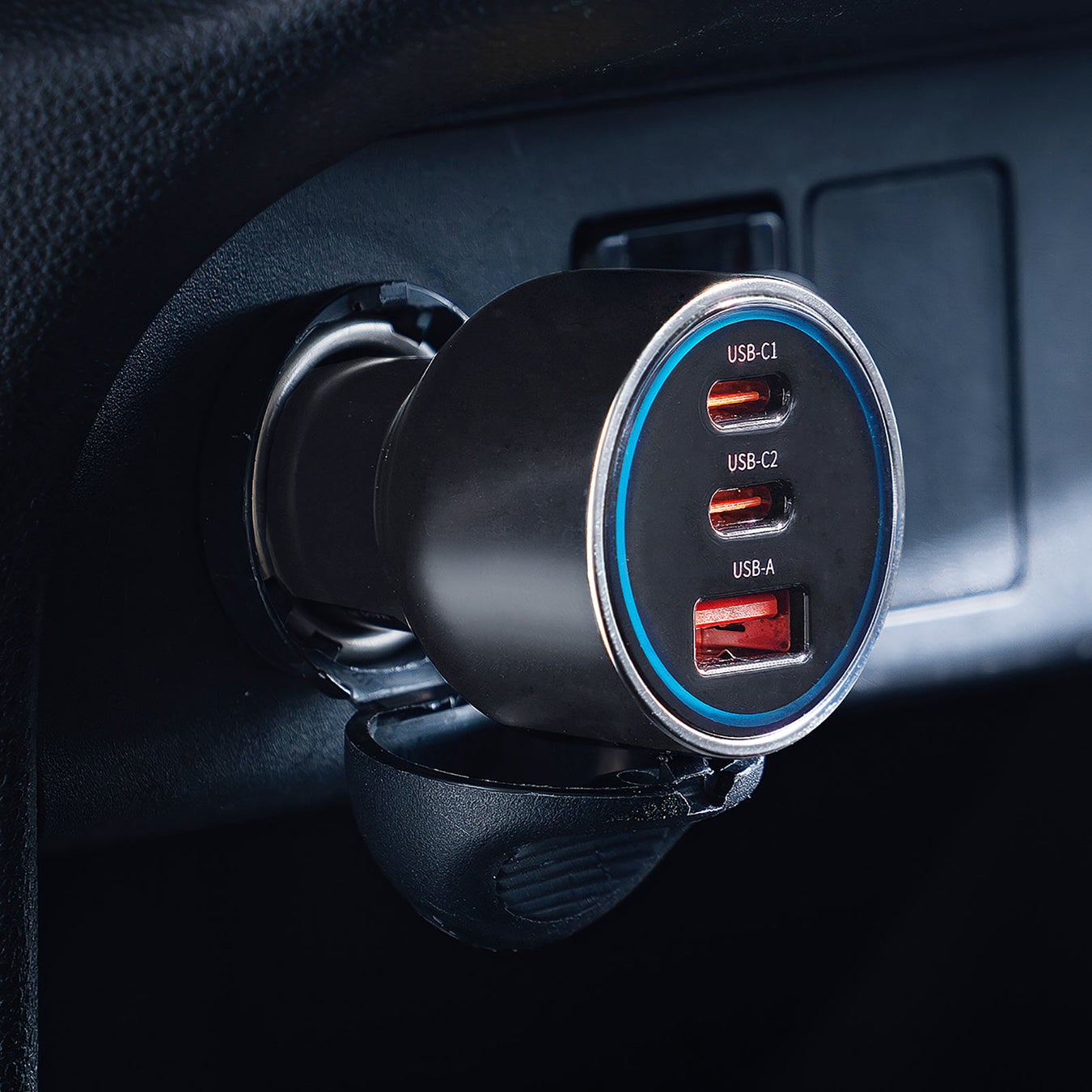 USB Type-Cポートを2つ、USB-Aポートを1つ搭載し、最大3台のデバイスを同時に充電可能。急速充電が必要なスマホやタブレットをはじめ、家族や同乗者とシェアしながら快適に利用できます。