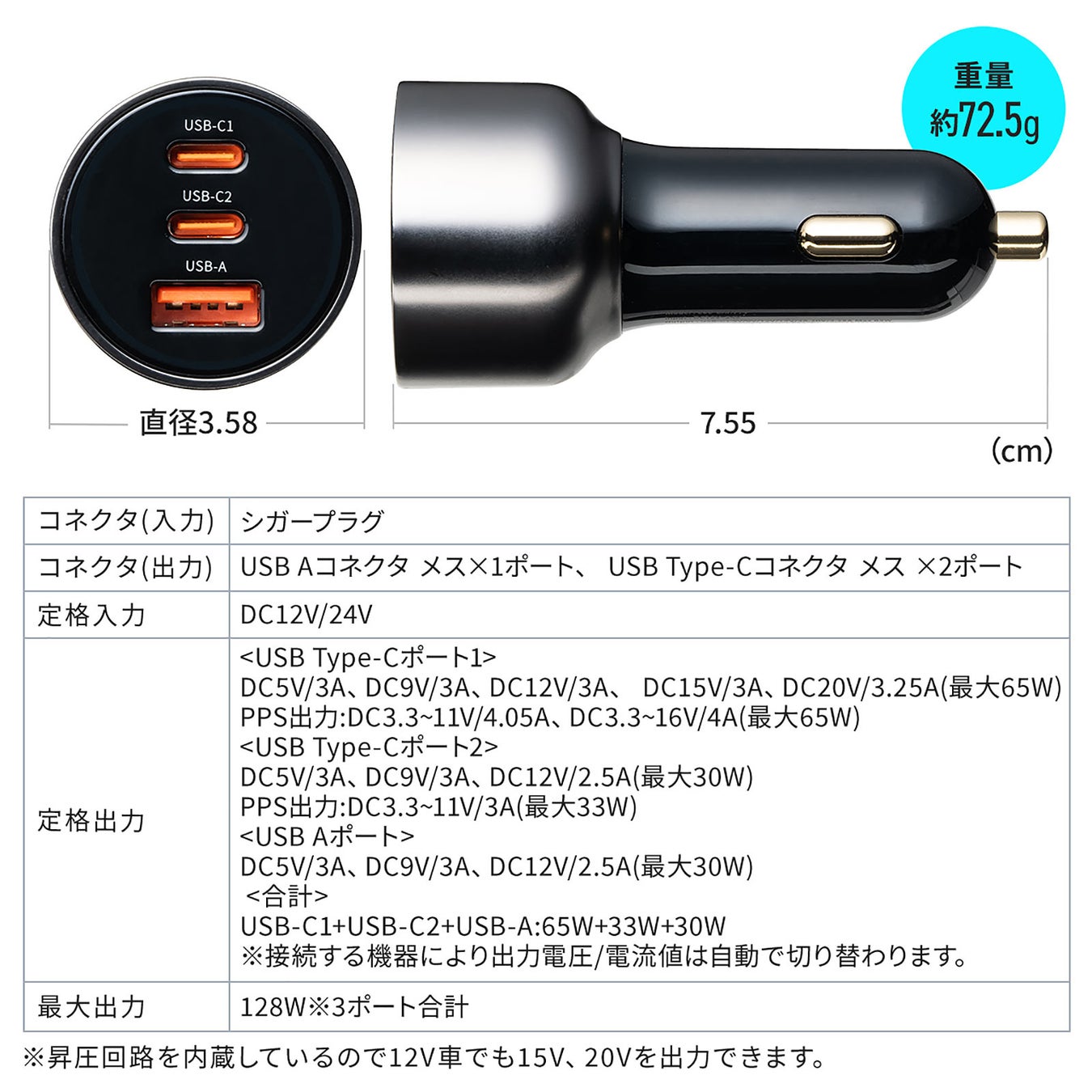 カーチャージャー PD対応 最大65W Type-C×2 USB-A×1 12V/24V車対応 PD-PPS対応 スマホ タブレット ノートパソコン Switch
