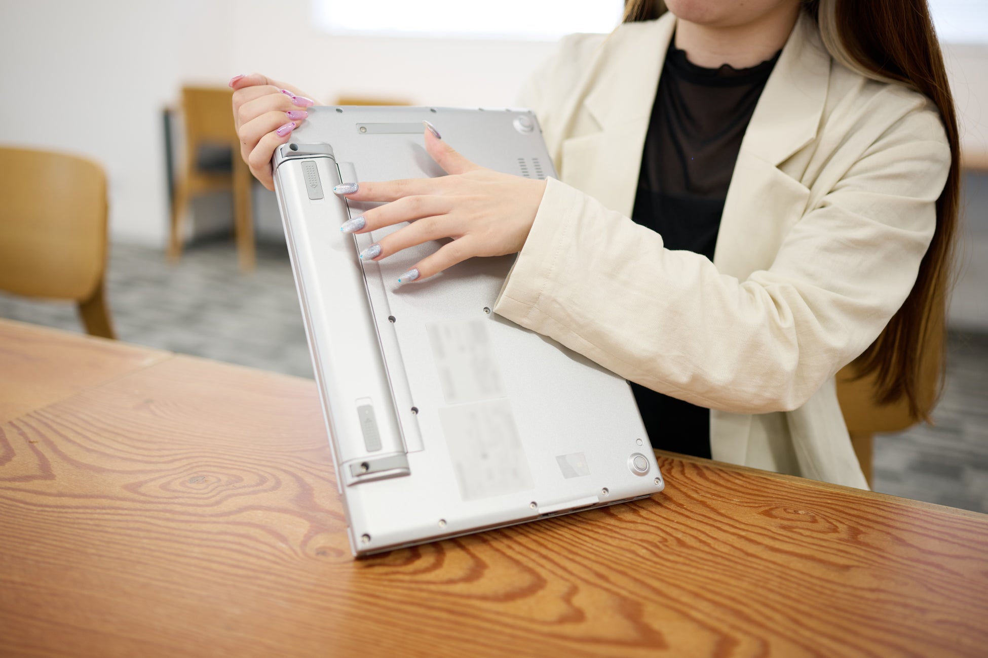 レッツノート独自のボンネット構造は、デスクの高さを想定した76 cmからの落下(※1)や、満員電車を想定した100 kgfの加圧・振動(※2)に耐えるための頑丈設計です。PCを持ち運ぶ働き方を前提に設計されたレッツノートは、テレワークとオフィスワークが混在し、持ち運ぶ機会が多い場合でも端末の故障リスク低減に寄与します。