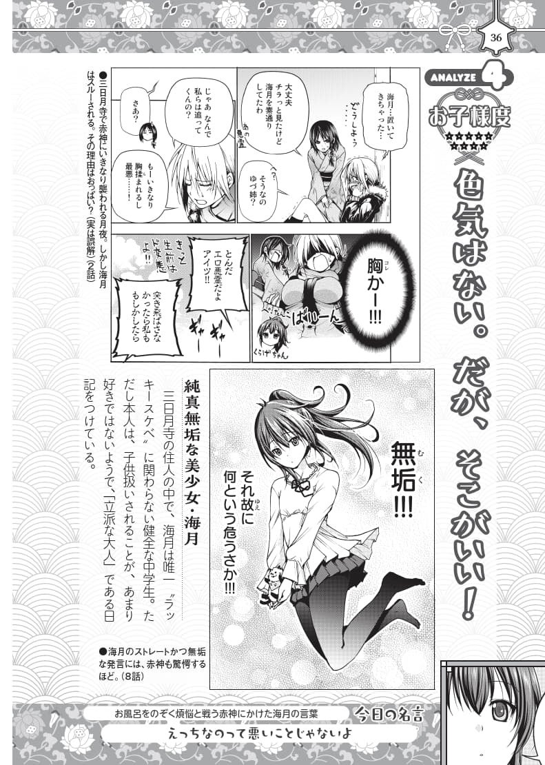 そのほか、本書でしか読めない単行本未収録の番外編マンガ「オトナになりたい海月ちゃん」や、「赤神明光 煩悩すごろく」、「赤神の出血大サービス」など抱腹絶倒の企画も満載! さらに各ページの下欄外にある「幸運助平御籤」では、ランダムに本書を開くことで、今日のあなたの助平な運勢を占うことができます。