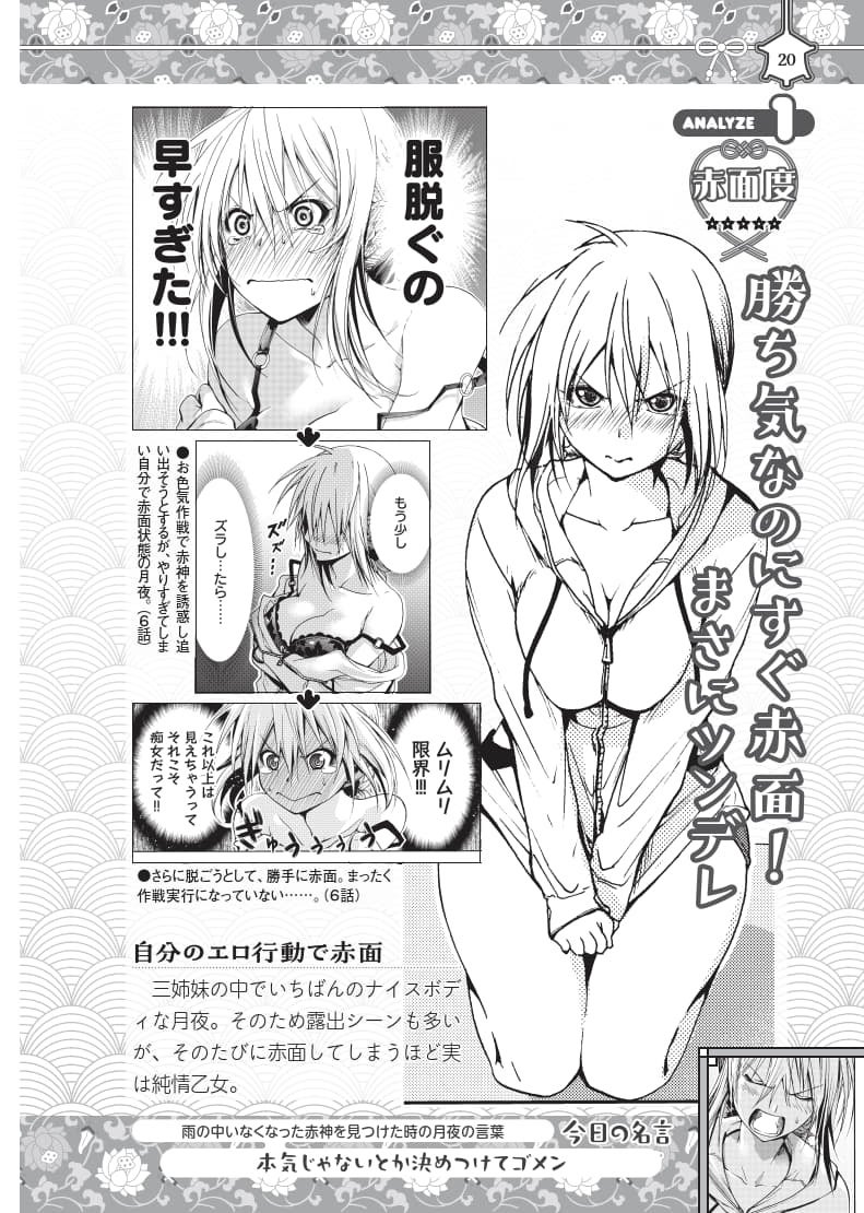 美少女を描かせたら日本一との呼び声も高い吉岡先生が描く、結月、月夜、海月、ミア、カグラの5大ヒロインのみならず、嬉々さんまで5大要素で完全解析! 青葉結月なら、天使力、筋力、猛進力、天然度、ムッツリ力の5要素で解析し、次女の青葉月夜なら、赤面度、妄想力、行動力、ダメダメ度、暴走度の5要素から解析するなど、それぞれのヒロインごとに魅力ポイントを設定して、かわいさを追求しました。