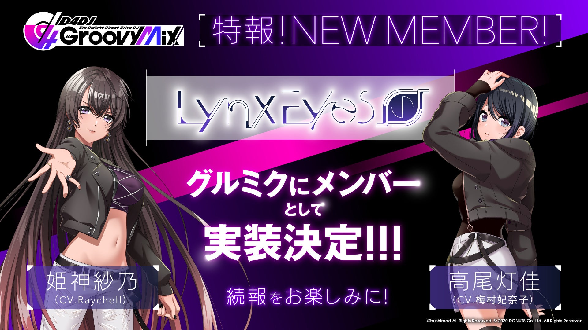 株式会社ブシロード(本社:東京都中野区、代表取締役社長:橋本義賢、以下ブシロード)は、株式会社DONUTS(本社:東京都渋谷区、代表取締役:西村啓成)と共同開発のスマートフォン向けリズムゲーム「D4DJ Groovy Mix」(以下グルミク)が、1月7日(金)・1月14日(金)に開催されたPeaky P-key×Lynx Eyes 合同LIVE TOURに出演したユニット「Lynx Eyes」の2人をメンバーとして実装することを決定いたしました。また、同公演のセットリストがプレイできるミッションを期間限定で実装いたしました。報道関係の皆様におかれましては、ぜひ本情報をお取り扱いいただけますよう、お願い申し上げます。
