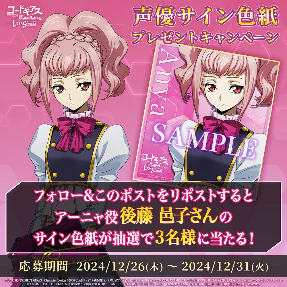 期間中にロススト公式Xをフォローし、対象のポストをリポストすると、 成田剣さん、 後藤邑子さんのサイン入り色紙が抽選で3名様に当たります。是非ふるってご参加ください!
