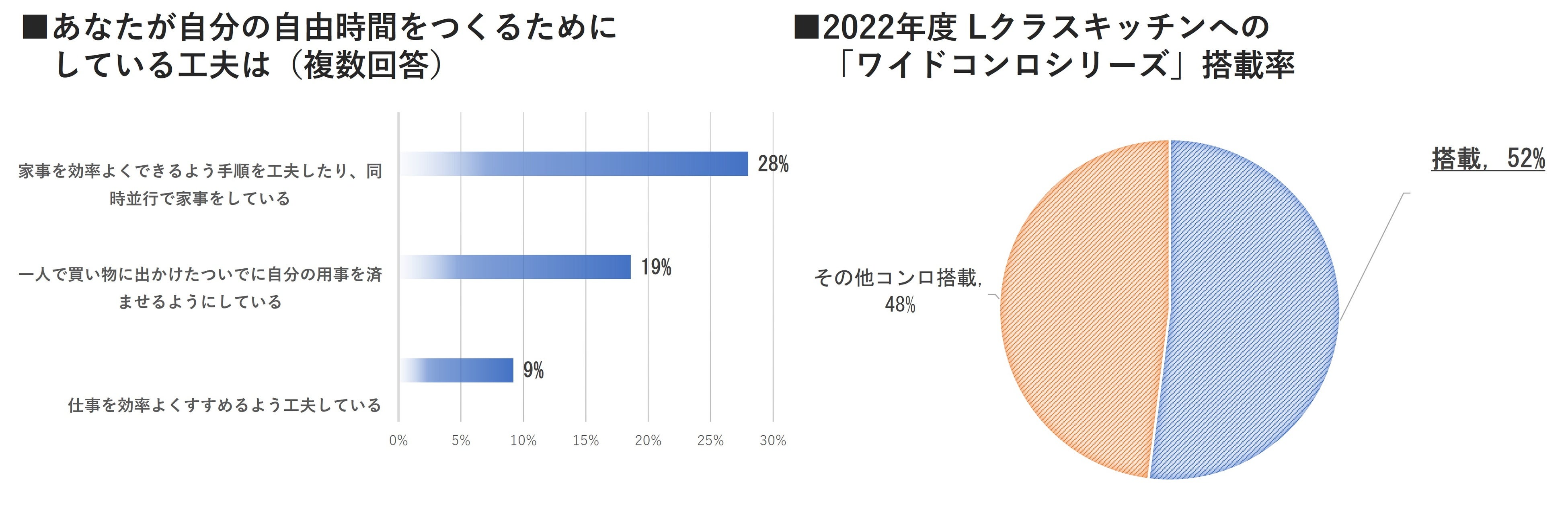 パナソニック ハウジングソリューションズ調査(※2)によると「あなたが自分の自由時間をつくるためにしている工夫は」という問いに対し「家事を効率よくできるよう手順を工夫したり、同時並行で家事をしている」と回答した方が約28%。自分時間確保のための、家事の効率化が求められています。2023年、ワイドコンロが誕生して15周年。利便性を評価いただき、2022年度システムキッチン「 Lクラス キッチン」における「ワイドコンロシリーズ」の搭載率は52%(※3)となりました。キッチンをご検討中で「ワイドコンロシリーズ」に魅力を感じていただけている方のご購入・ご応募をお待ちしております。