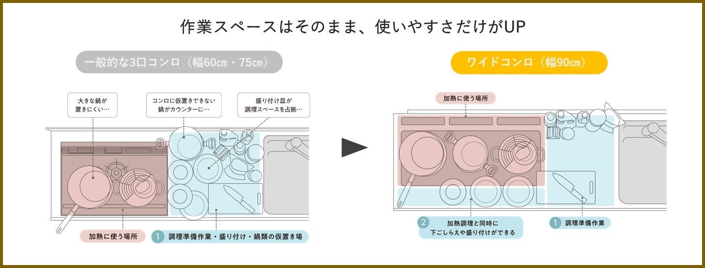一般的なコンロは、熱源が手前2つ、奥に1つの三角形の形状となっており、奥の熱源と手前の熱源を同時に使う方が少ないのが現状です。パナソニック ハウジングソリューションズのシステムキッチン(Lクラス キッチン・ラクシーナ)に搭載できる「ワイドコンロシリーズ」は、パナソニック独自の横並び形状のため、3~4つのお鍋を同時に使うことが可能。加熱場所の手前に16 cmのスペースがあるため、盛り付けなどの作業に使用いただけ、効率よく料理をすることができます。