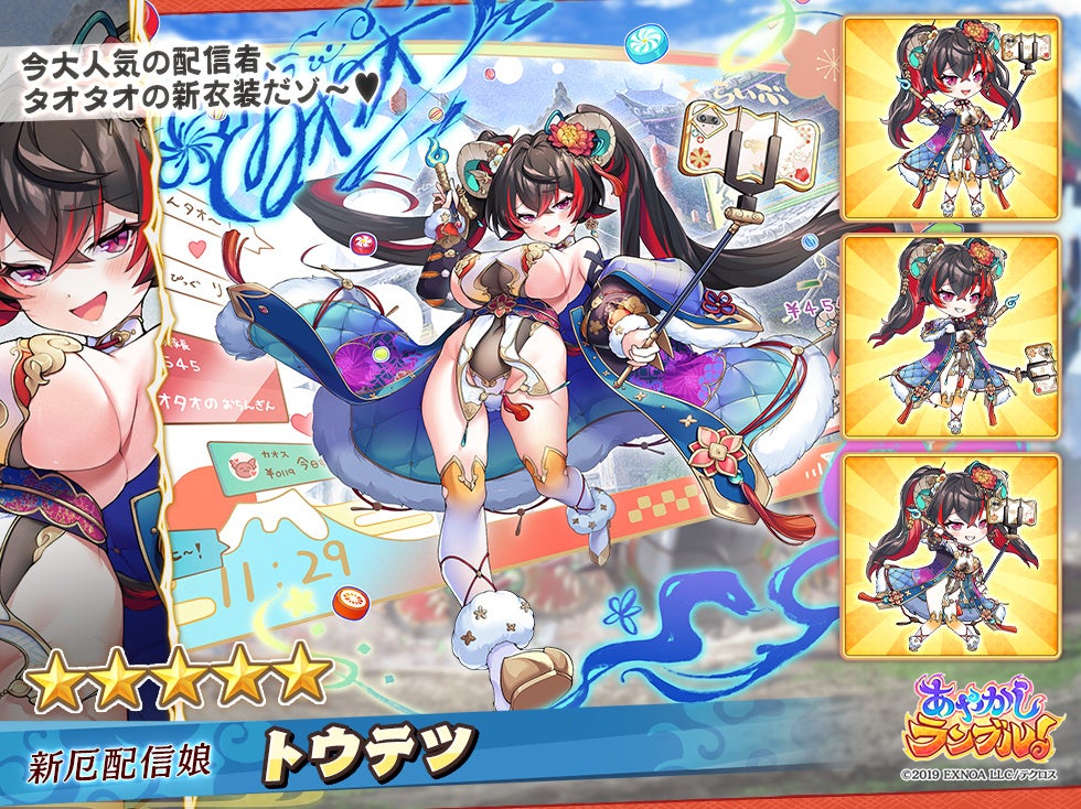 合同会社EXNOA(本社:東京都港区、CEO:村中 悠介、URL:https://games.dmm.com/)が運営するDMM GAMESにおいて、あやかし美少女たちと冒険する、迎撃型爽快スキルバトルRPG『あやかしランブル!』(https://ayarabu.jp/)は、1月1日に、新たに期間限定「★5 サツチ」「★5 トウテツ」「★5 シャオ」を追加したことを発表しました。