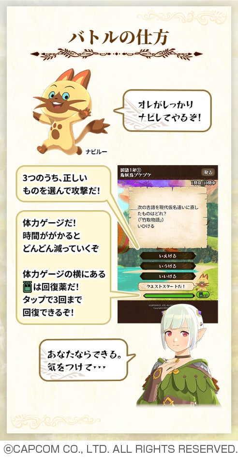モンスターハンター ストーリーズの「相手に勝てる選択肢を3つの中から選ぶ」を学習クイズに応用!ライダーとして討伐クエストをこなしながら、夏休みの復習に取り組める!