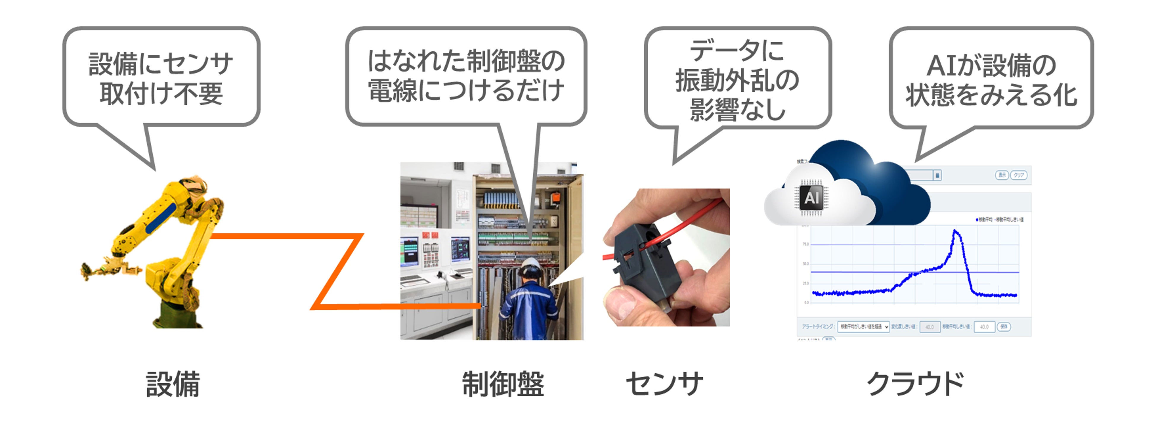 設備診断に広く使われる振動センサと比べ、設備に直接センサを取り付けする必要が無く、制御盤への設置で利用可能です。故障予知製品の検討時にありがちな、