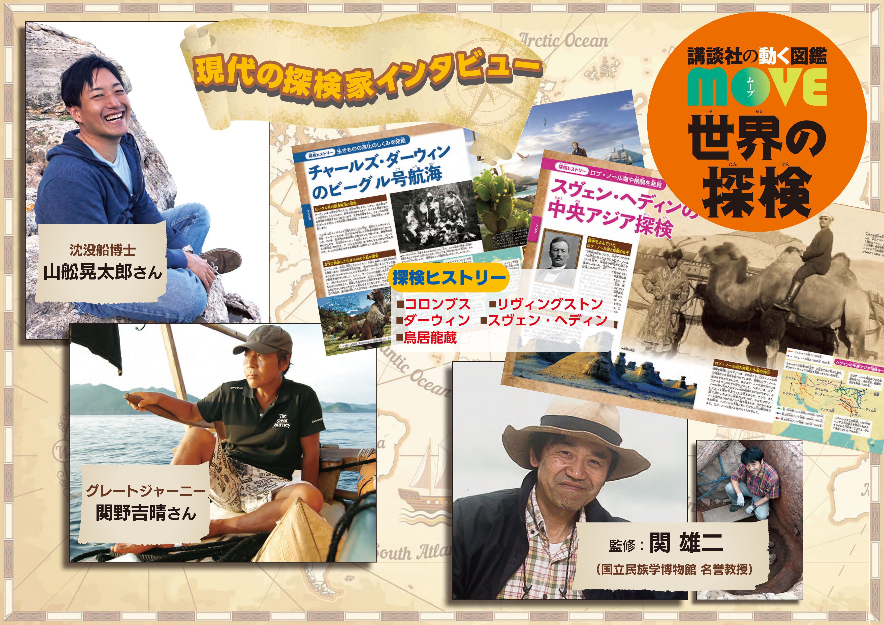 現代の探検家・考古学者へのインタビューとして、人類の起源をたどる旅、グレートジャーニーで有名な探検家、関野吉晴さんと、沈没船博士として近年様々なメディアで注目されている水中考古学者、山舩晃太郎さんが登場。
