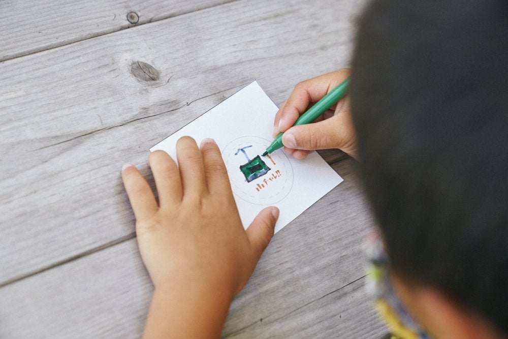 好きな絵を描いて色を塗って、機械で挟めば、あっという間に完成。