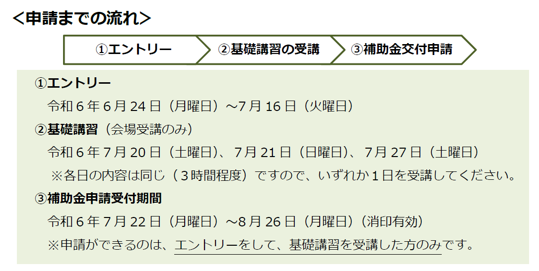 補助金の申請にあたっては、「エントリー」と「基礎講習※」の受講が必須です。