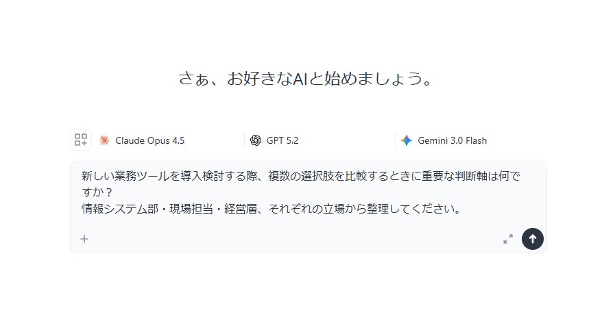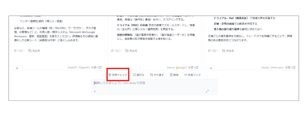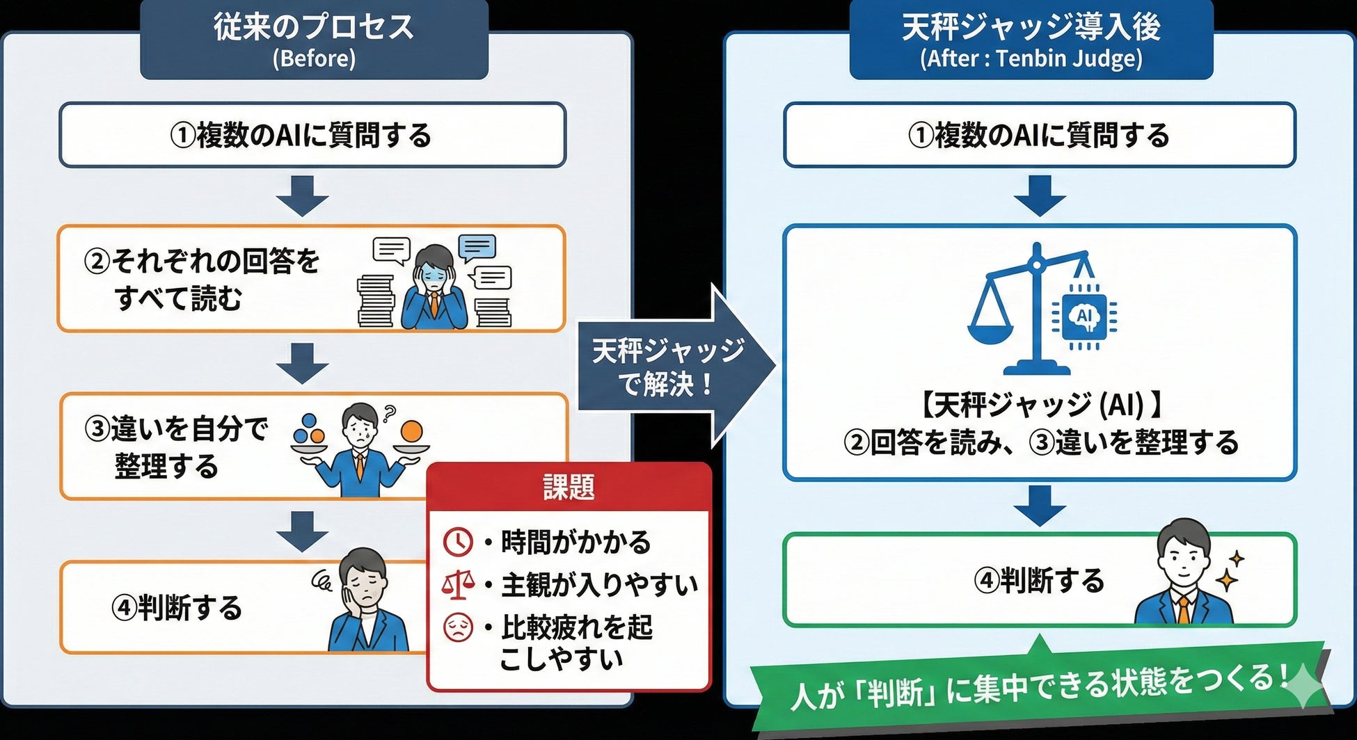 このたび提供を開始した「天秤ジャッジ」は、複数のAIモデルが生成した回答を AIが自動で読み解き、比較・評価する機能です。従来の回答比較では人間が長文を読み比べる必要がありましたが、「天秤ジャッジ」では各モデルの共通点、相違点、独自の視点を構造的に整理し、さらに 実用性や論理性の観点から回答の評価・推薦を行います。これにより、ユーザーは 膨大な候補の中から迅速に最適な回答を見つけることが可能 になります。