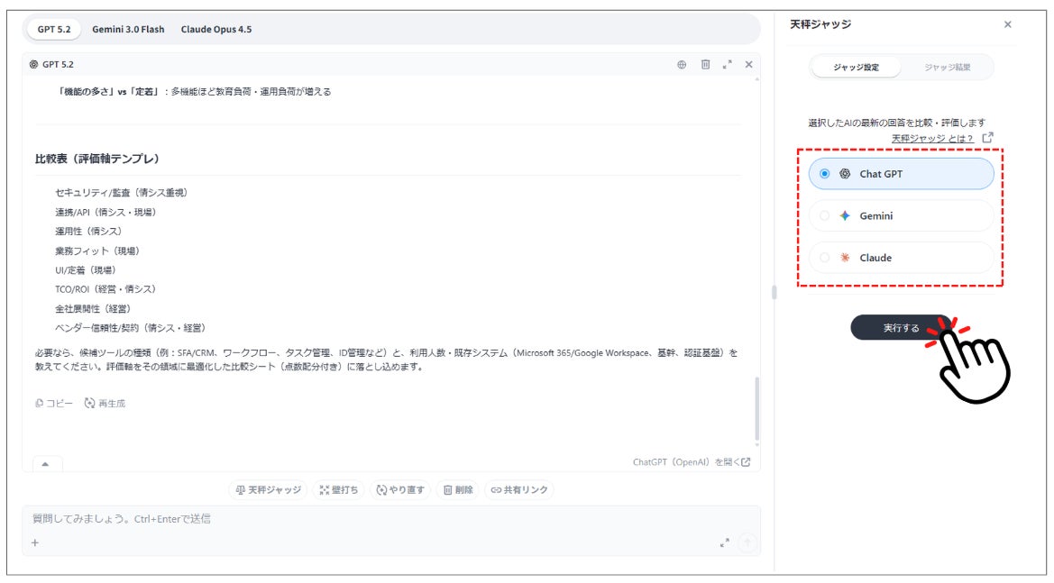 3. 複数AIの回答を「どのAIに評価させるか」を選択する