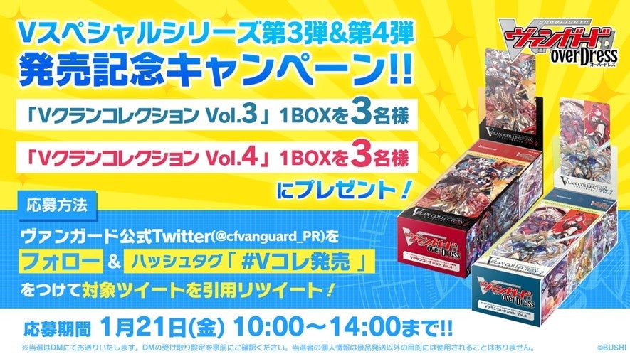 株式会社ブシロードは、1月21日(金)に、「カードファイト!! ヴァンガード」の最新商品、Vスペシャルシリーズ第3弾「Vクランコレクション Vol.3」、Vスペシャルシリーズ第4弾「Vクランコレクション Vol.4」を同時発売することをお知らせいたします。報道関係の皆様におかれましては、ぜひ本情報をお取り扱いいただけますようお願い申し上げます。
