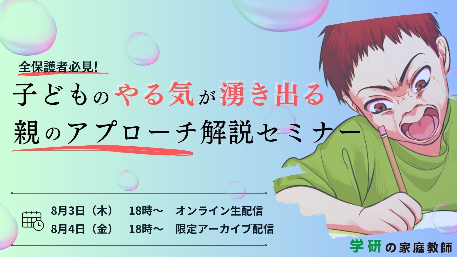 学研の家庭教師が、「【全保護者必見!】子どものやる気が湧き出る親のアプローチセミナー」を8月3日(木)、8月4日(金)に開催します!