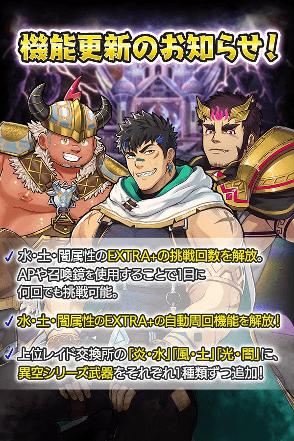 水属性レイドボス「ゲイボルグ」と土属性レイドボス「ミョルニル」と闇属性レイドボス「アダマス」に挑戦しやすいキャンペーンがスタート!
