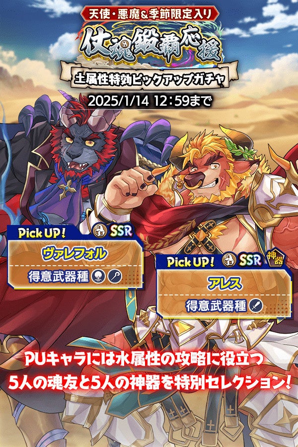 「ヴァレフォル」「アレス」など天使・悪魔&季節限定キャラを含む、土属性特攻ピックアップガチャが開催!水属性の攻略に役立つ、5人の魂友と5人の神器がピックアップされた「仗魂鍛覇応援土属性特攻ピックアップガチャ」をお見逃しなく。