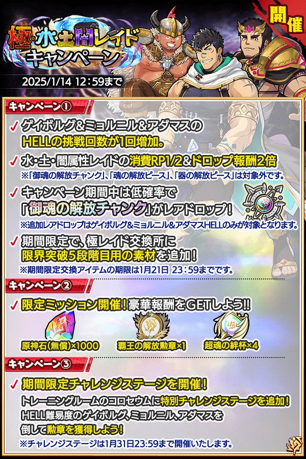 キャンペーン期間中「ゲイボルグ」「ミョルニル」「アダマス」の挑戦回数増加やレイド救援時のRP半減、ドロップ報酬2倍となるおトクなキャンペーンです。