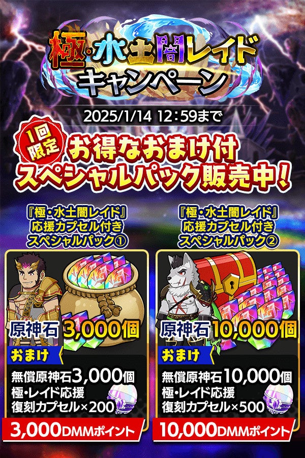 また、原神石がおトクに入手できる「極・水土闇レイドキャンペーンスペシャルパック」も同時に登場!