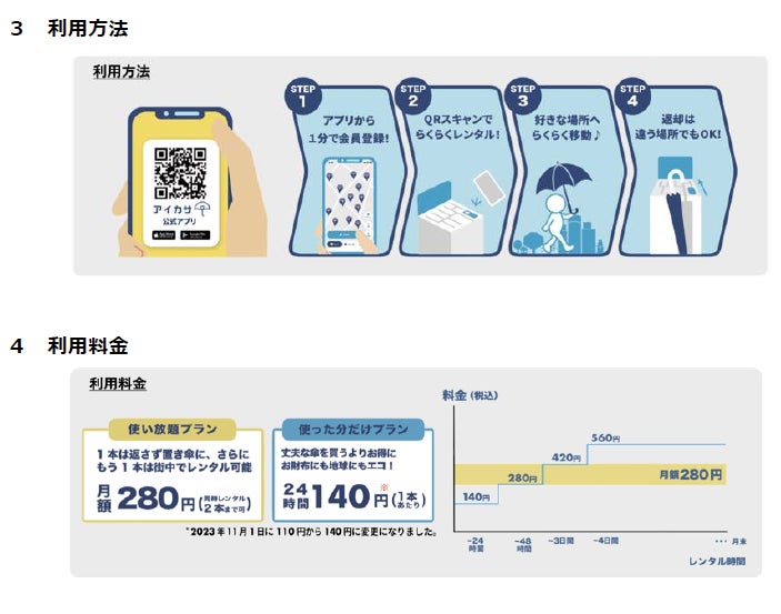 『アイカサ』は、“雨の日を快適にハッピーに“と”使い捨て傘をゼロに“をミッションに2018年12月にサービスを開始した日本初の本 格的な傘のシェアリングサービスです。突発的な雨にもビニール傘をその都度購⼊せずに、駅や街中で丈夫でサステナブルな『アイカサ』を借り、雨が⽌んだ際には最寄りの傘スポットに傘を返却することでエコに貢献しながら(※)、⼿ぶらで便利に移動ができるのが特徴です。現在は、アプリ登録者数50万⼈を超え、東京駅や新宿駅をはじめとした都内全域と関東、関⻄、愛知、岡山、福岡、佐賀など12都道府県で展開し、スポット数1350箇所以上に設置しています。