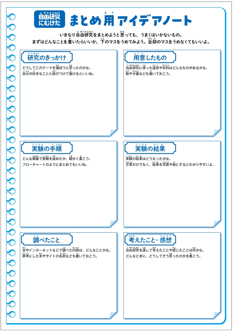 「研究のきっかけ」「調べたこと」など、実験をしながら書き込んでおくと、自由研究がぐっとまとめやすくなるメモも無料ダウンロードできます。試行錯誤した過程を記録して、自分だけの自由研究を完成させましょう。