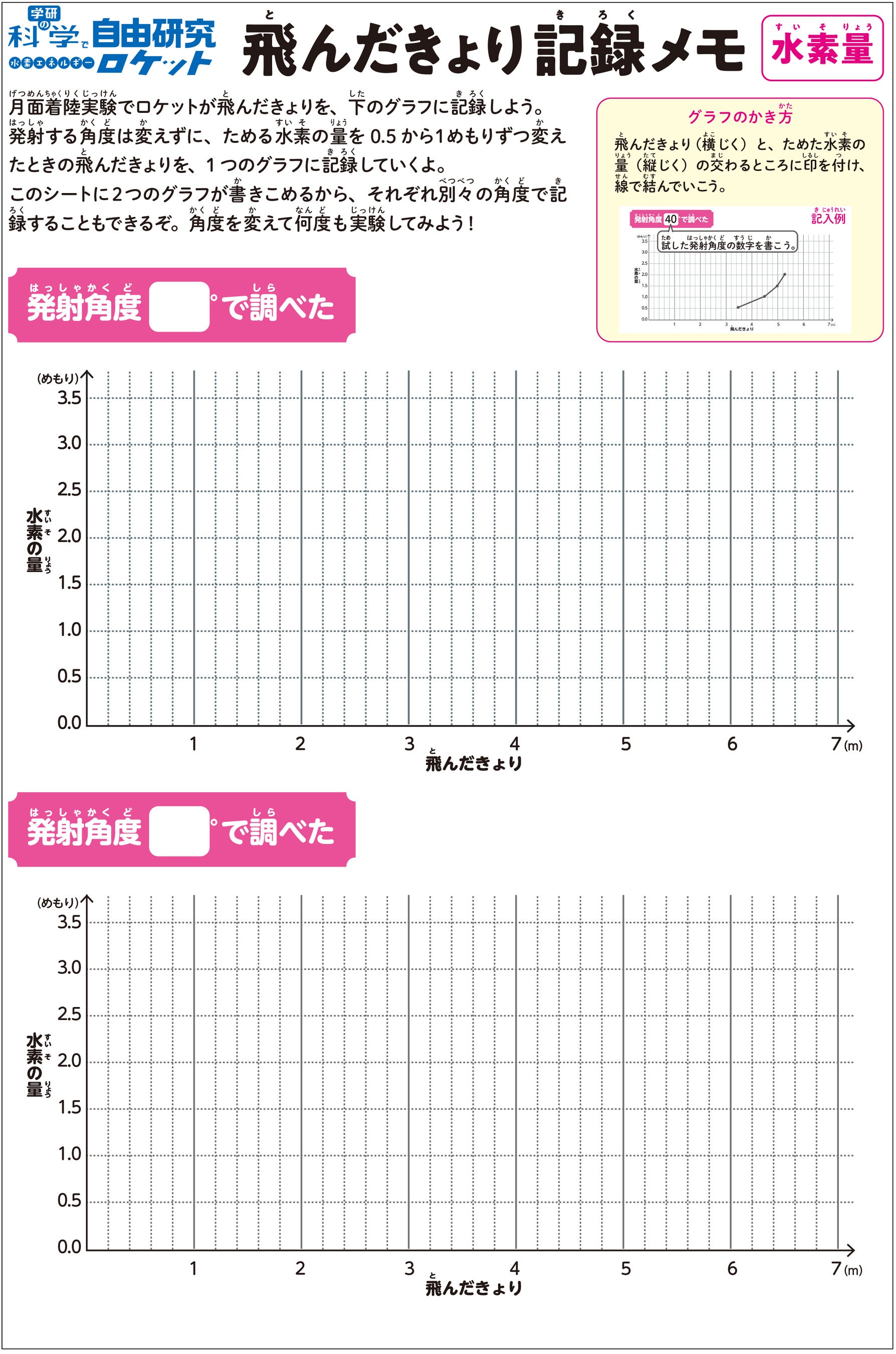 ▲「水素エネルギーロケット」では、水素量と発射台の角度を調整して、ちょうど3.8m先の“月面”に着陸させる「月面着陸実験」の自由研究に挑戦。水素量や角度を変え、飛び方をメモしながら何度も飛ばすことで、研究の精度が上がります。