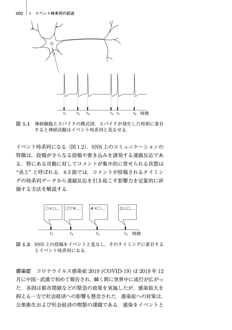 統計スポットライト・シリーズの第6巻。感染症や地震、SNSの投稿といった自然現象や社会現象を時系列のイベントととらえ、その起き方をモデル化して各現象の解析や将来予測につなげる主な手法に「点過程」と呼ばれる確率過程と「状態空間モデル」があります。