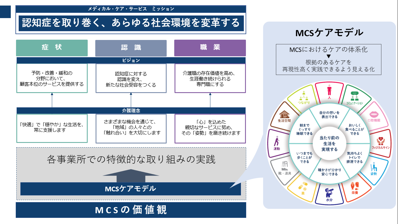 これまで蓄積してきた各事業所での特徴的な取り組みを生かしつつ、「MCSケアモデル」をケアの基盤とし、介護スタッフ間でケアの目的や考え方に対する共通認識を持つことで、当社のミッション「認知症を取り巻く、あらゆる社会環境を変革する」やビジョンの実現に向けて取り組んでまいります。