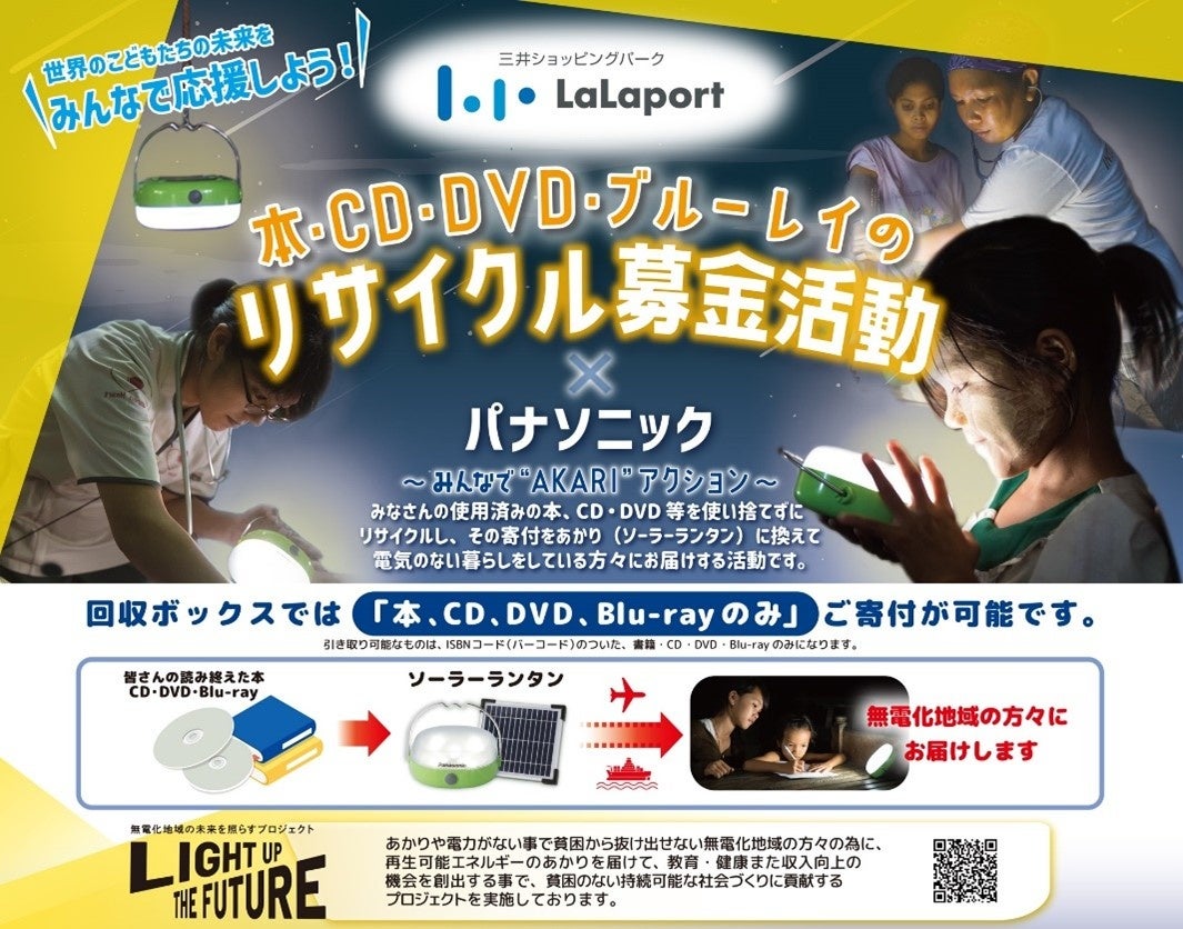 首都圏地区の6つのららぽーと施設内に「みんなで”AKARI”アクション」のリサイクル募金用の寄付ボックスを設置し、読み終えた本やCD、DVD、ブルーレイの寄付を呼びかけます。寄付いただいたリサイクル品は嵯峨野株式会社が運営するサービス「きしゃぽん」を通じて買い取りを行い、その金額をソーラーランタンに換えてアジアやアフリカの電気のない暮らしをしている方々にお届けします。