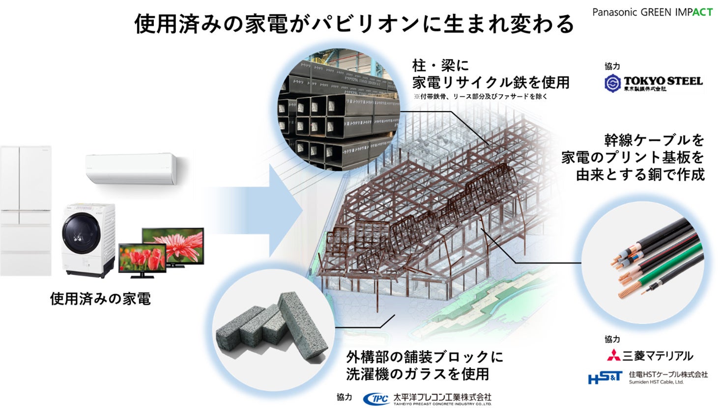 パナソニックグループでは、2013年より、東京製鐵株式会社(以下、東京製鐵)とともに、家電リサイクル工場から回収した鉄スクラップを再び製品材料の鉄として使用する資源循環のスキームを構築しています。パビリオンの建築においても、パビリオンで利用する鉄約118トン(付帯鉄骨、リース部分およびファサードを除く)の約82%、主な柱・梁(接合部のプレート等を除く)約98%にあたる97.1トンに、このリサイクル鉄を用います。また、万博の期間終了後には、再度、東京製鐵に戻し、パナソニックグループの製品等の材料として使用していきます。