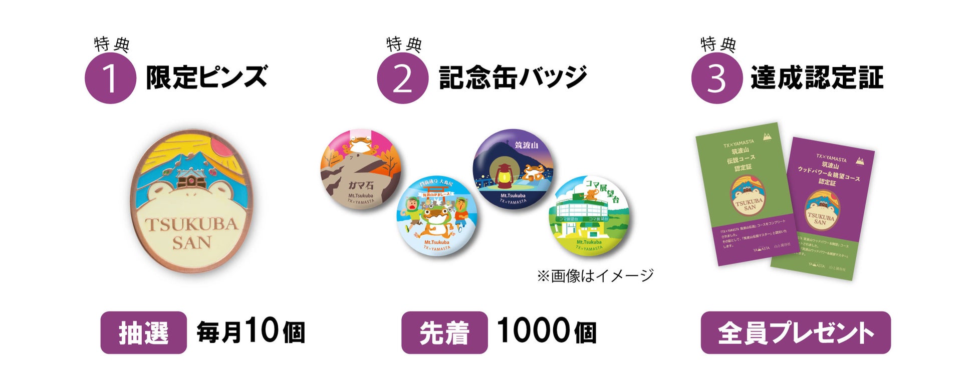 スタンプラリーコースを達成すると、記念缶バッジ(先着1,000個限定、14種)と達成認定証(コース別、2種)がもらえるほか、山のお土産ブランド「Yamasanka(ヤマサンカ)」とコラボした人気の特製ピンズ(毎月10個抽選)に応募することができます。