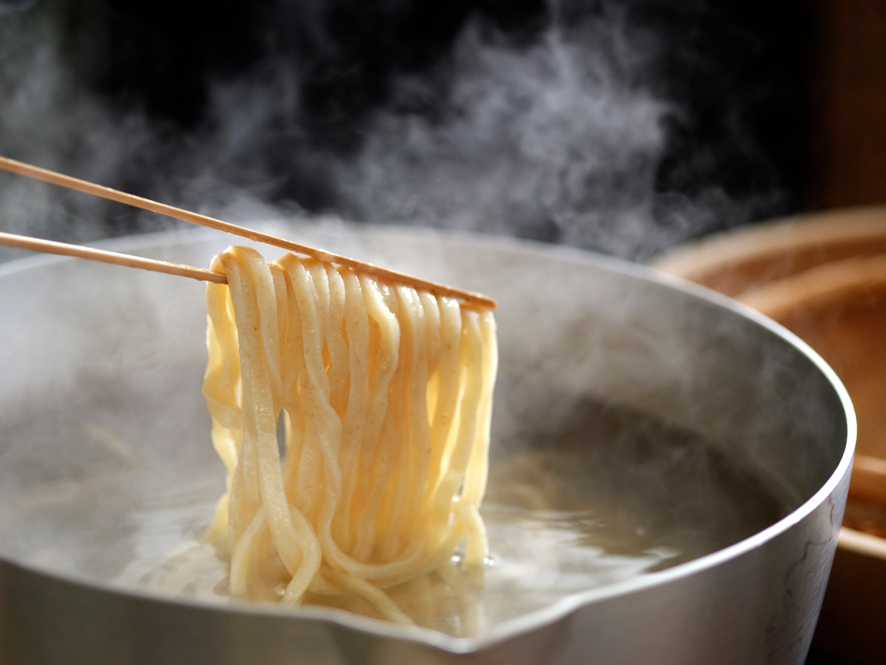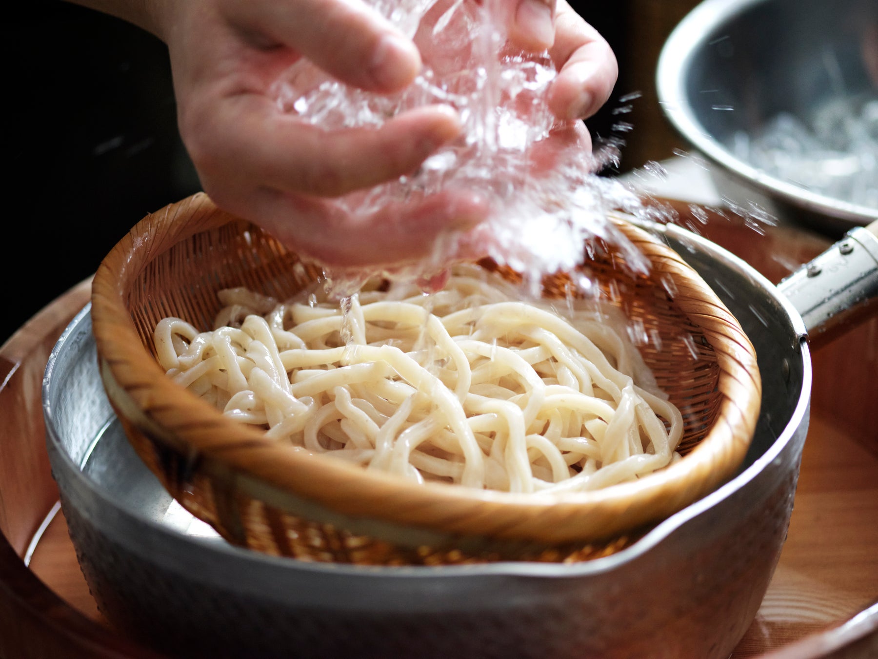 武蔵野うどんは、一般的なうどんよりも太く、強いコシと噛みごたえが特徴。毎日店内で製麺し、打ちたて・茹でたての麺を提供することで、小麦本来の香りと食感を最大限に引き出します。