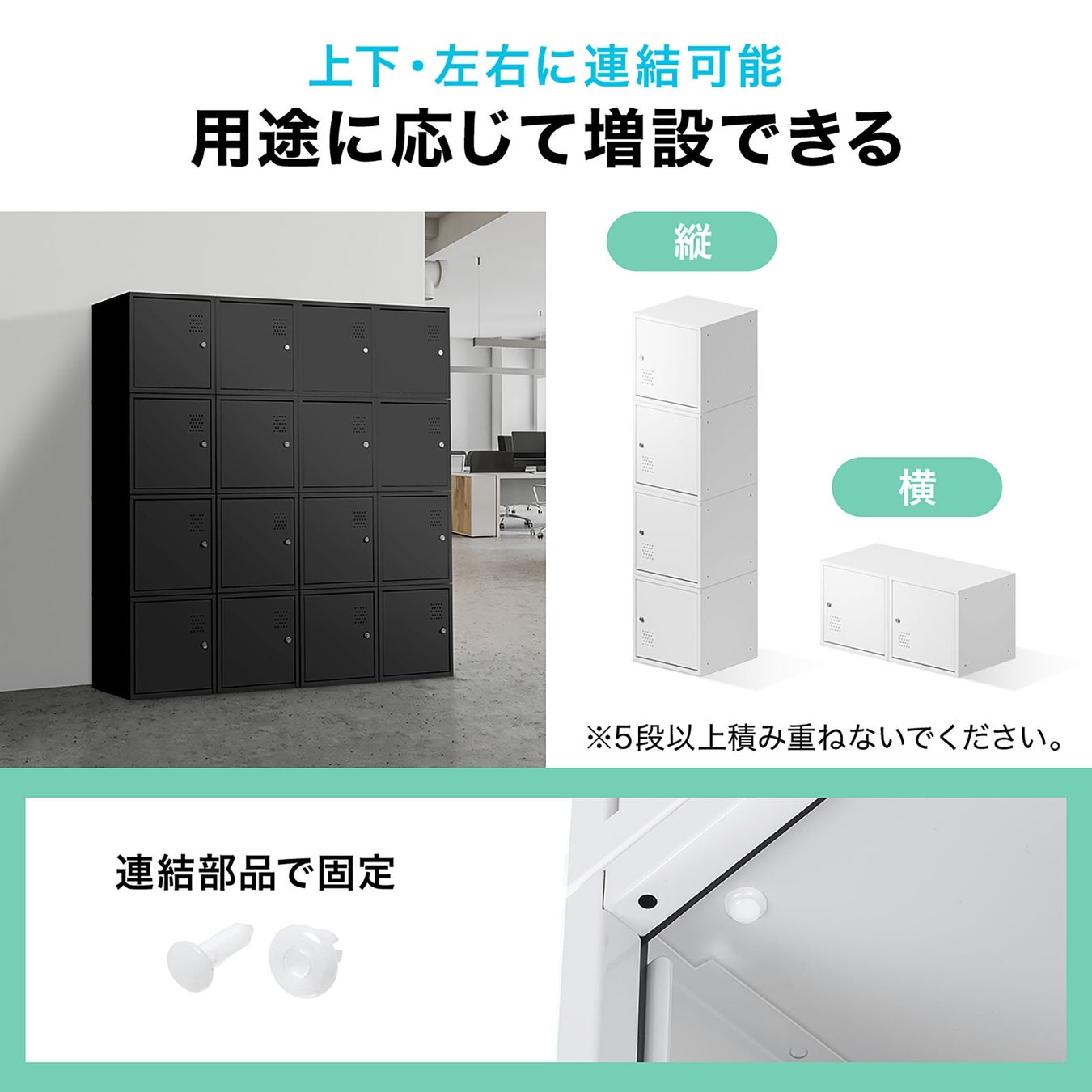 連結パーツを使用して、ボックスを縦連結、横連結、縦横連結が可能で、収納箇所を増やすことができます。(上下は5段まで)