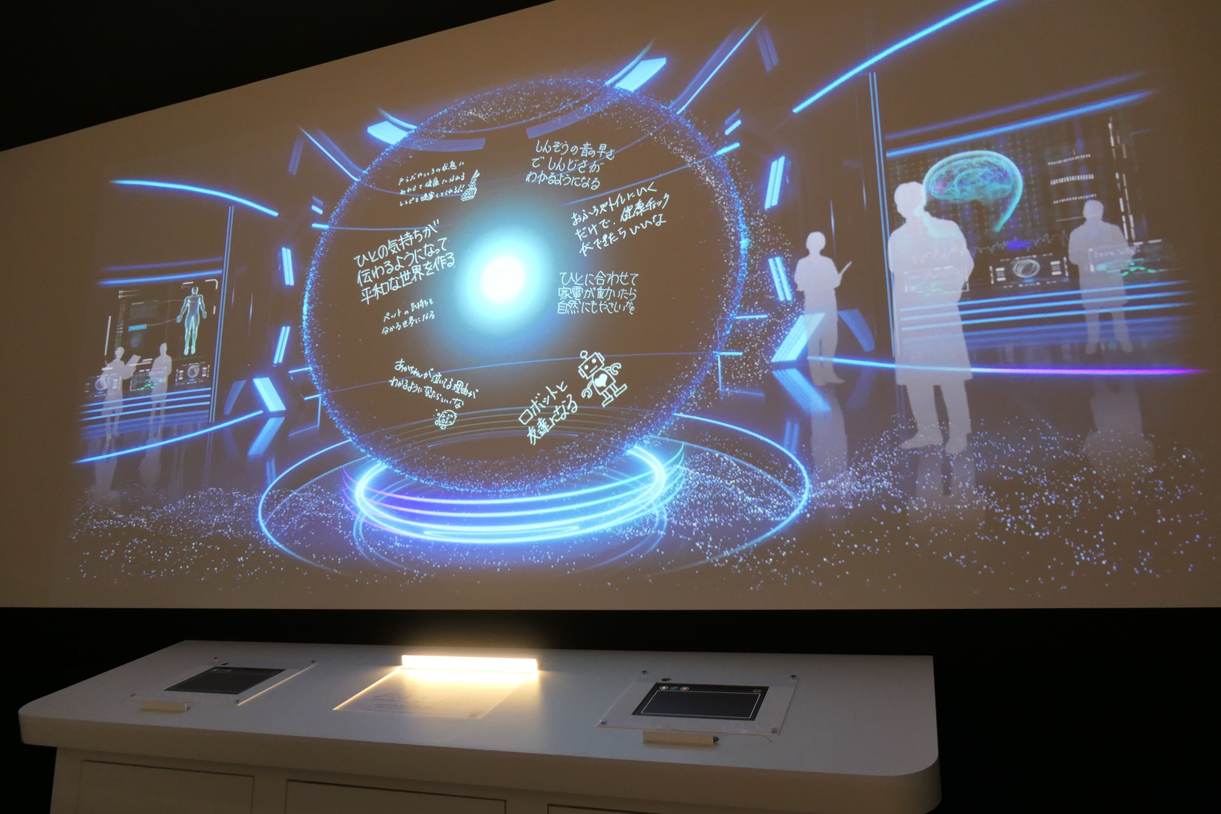 ひとを理解する技術でどんなくらしが実現できるか、子どもたちが主体的に考えたことを大きなスクリーンに投影して表現します。