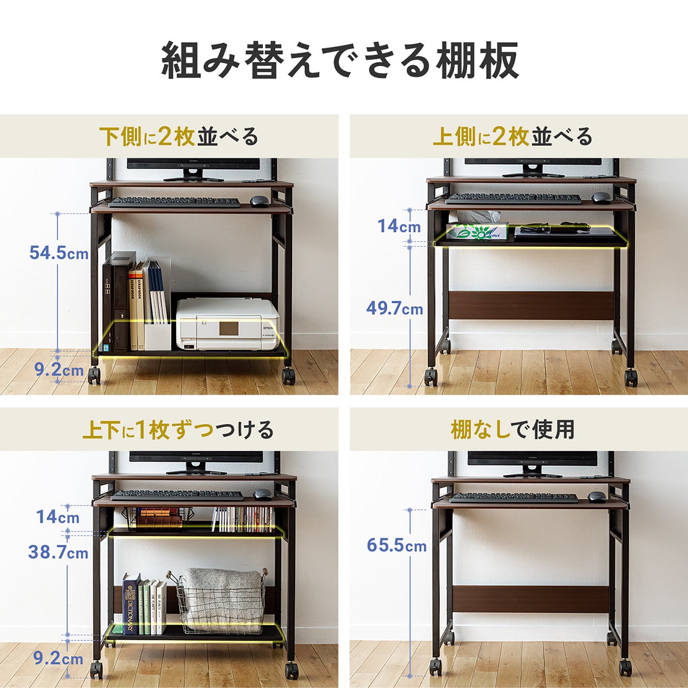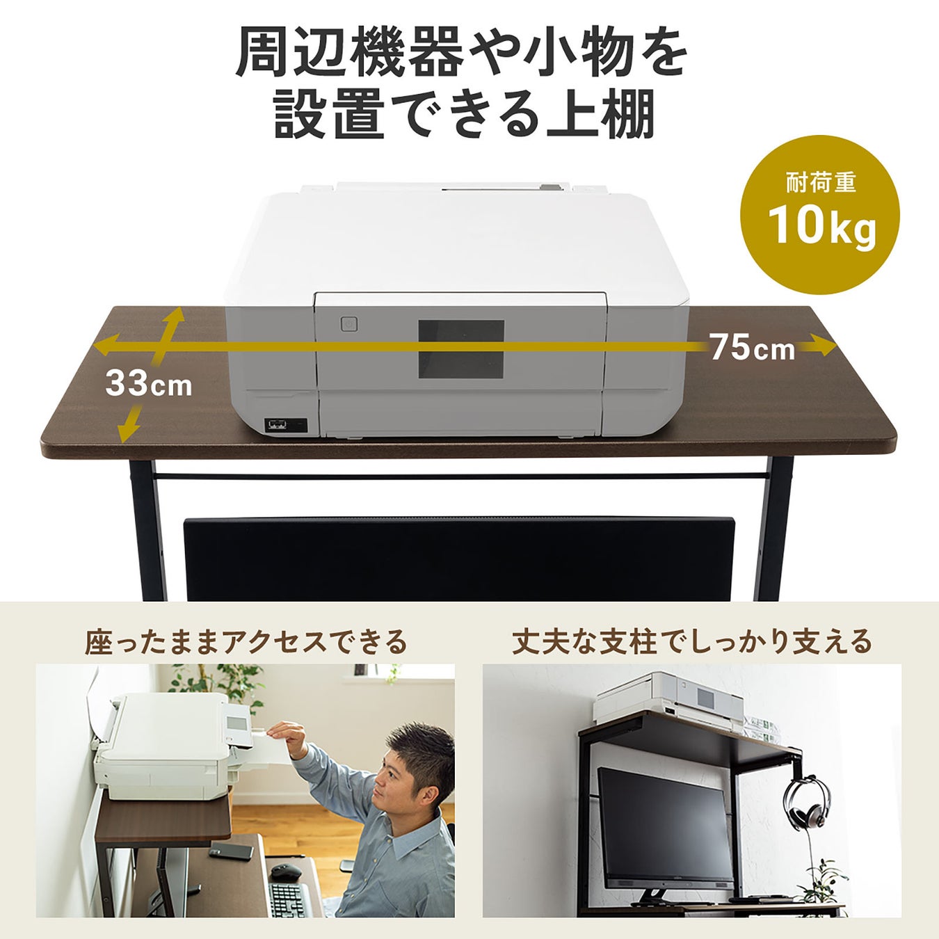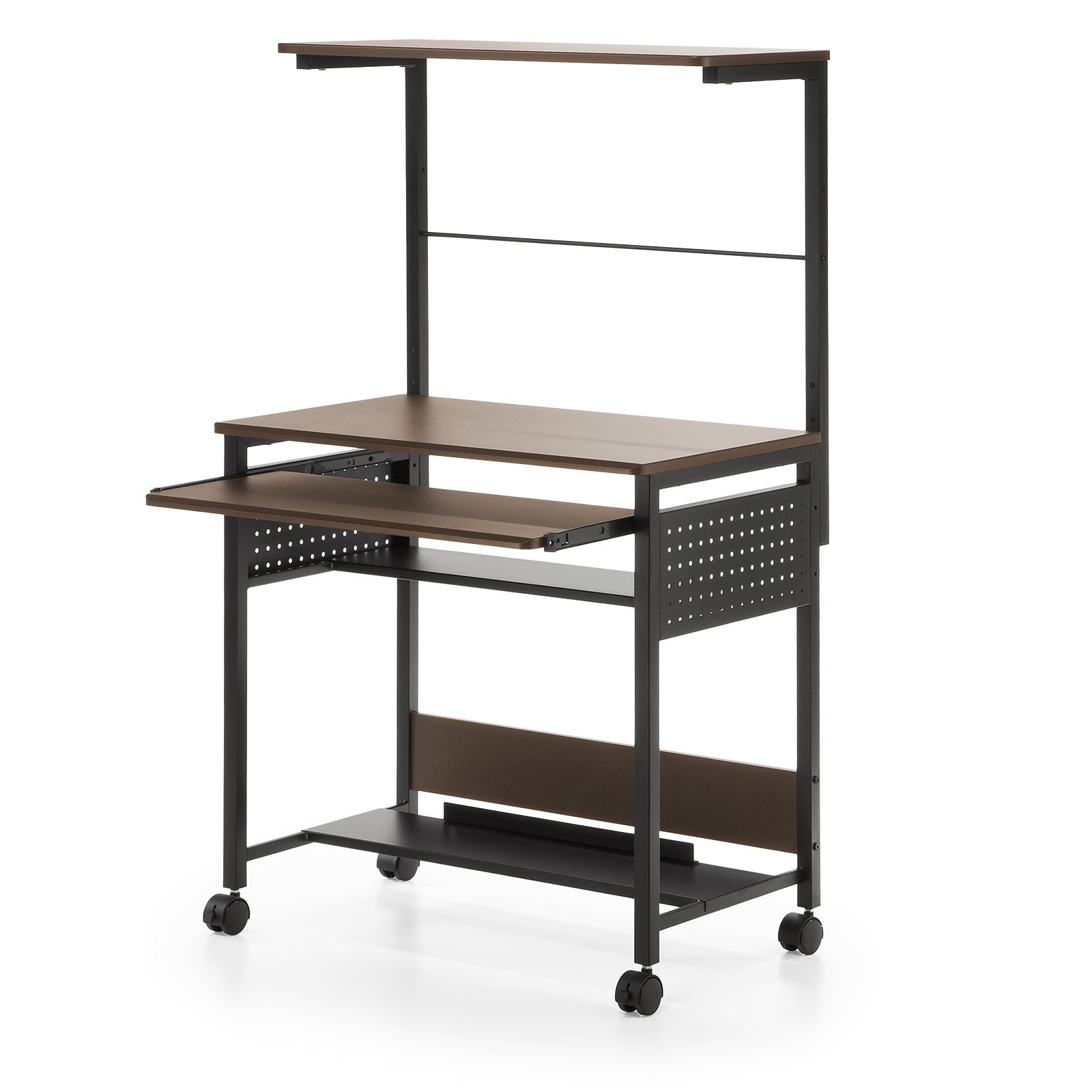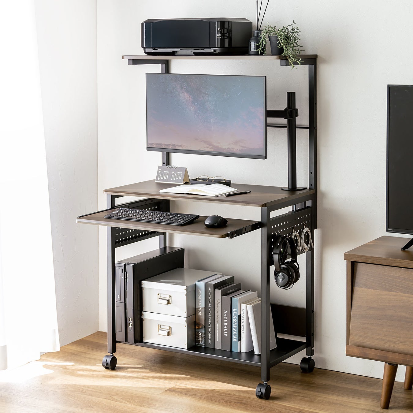幅75cm パソコンデスク キーボードスライダー 木目調 ブラウン 有孔ボード コンパクト 収納棚付 棚組み替え キャスター付 サブテーブル付