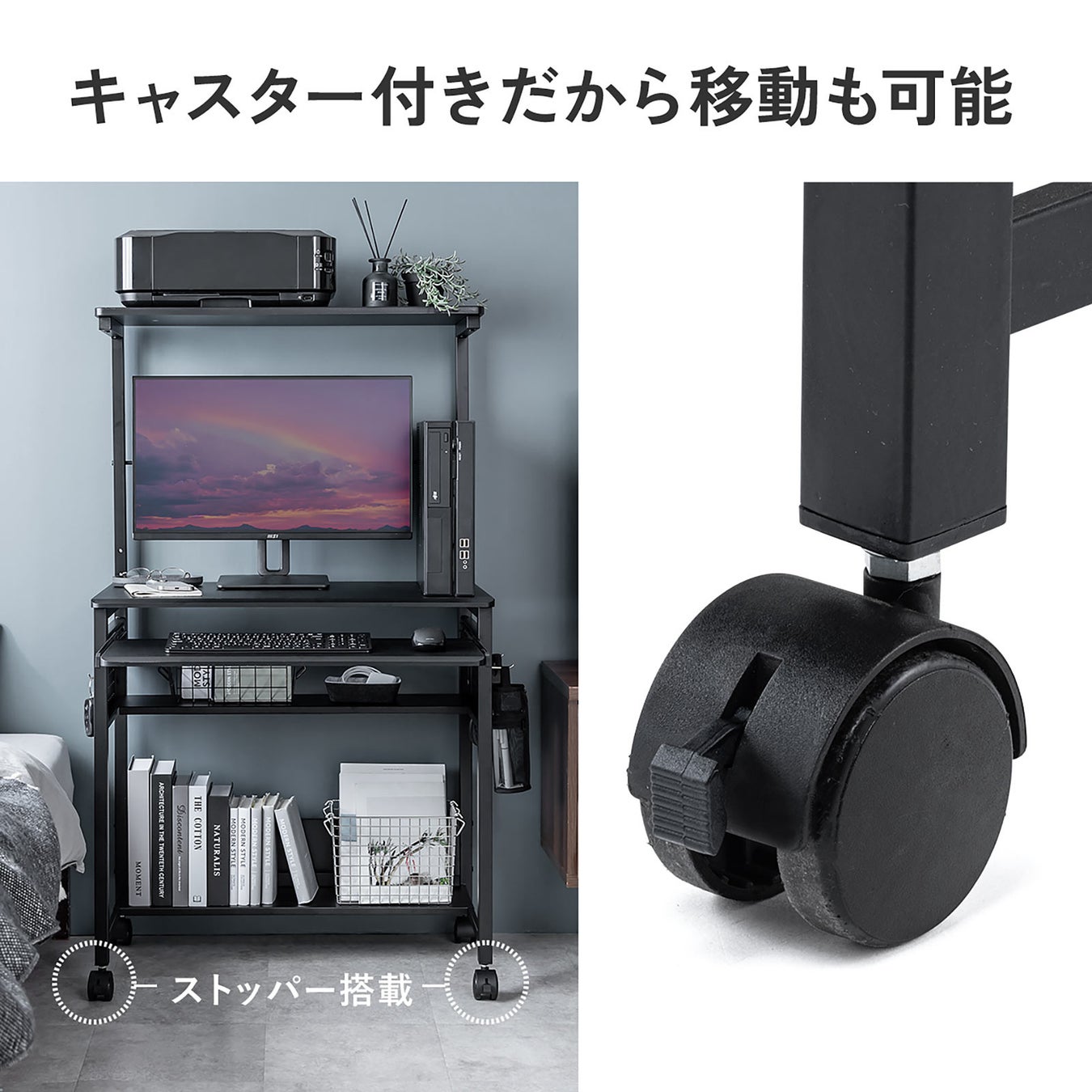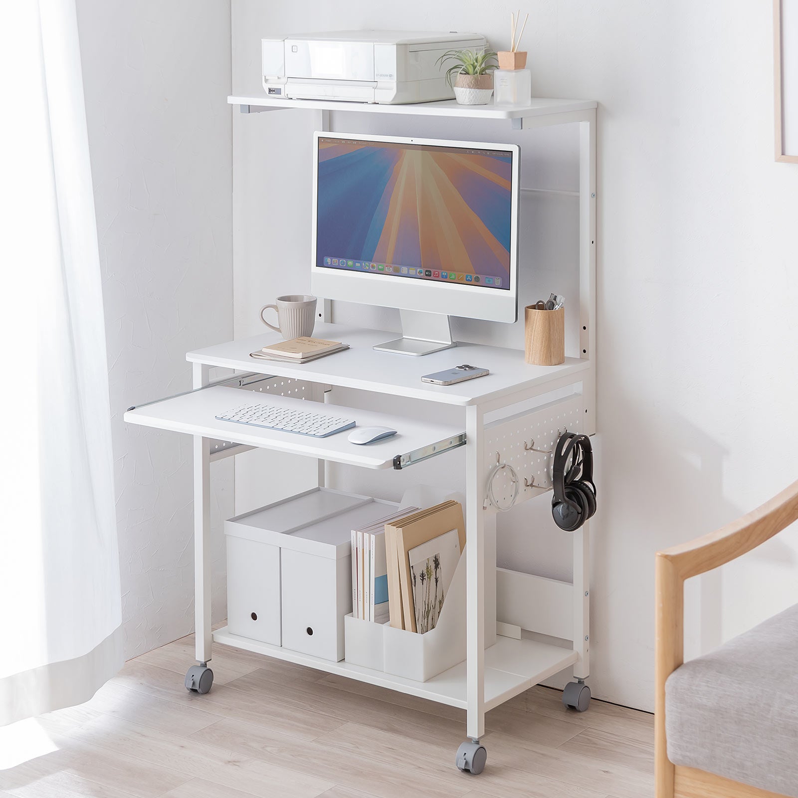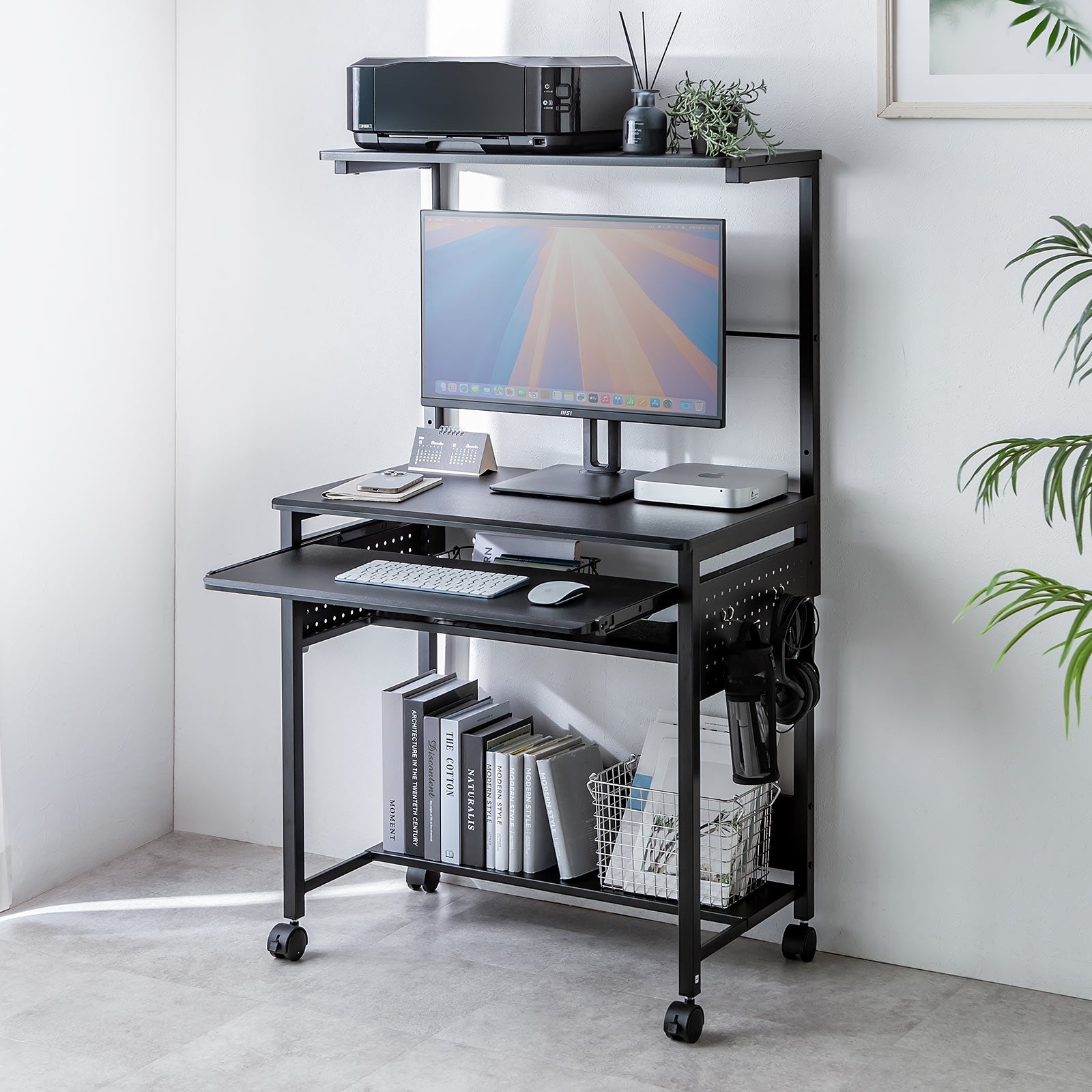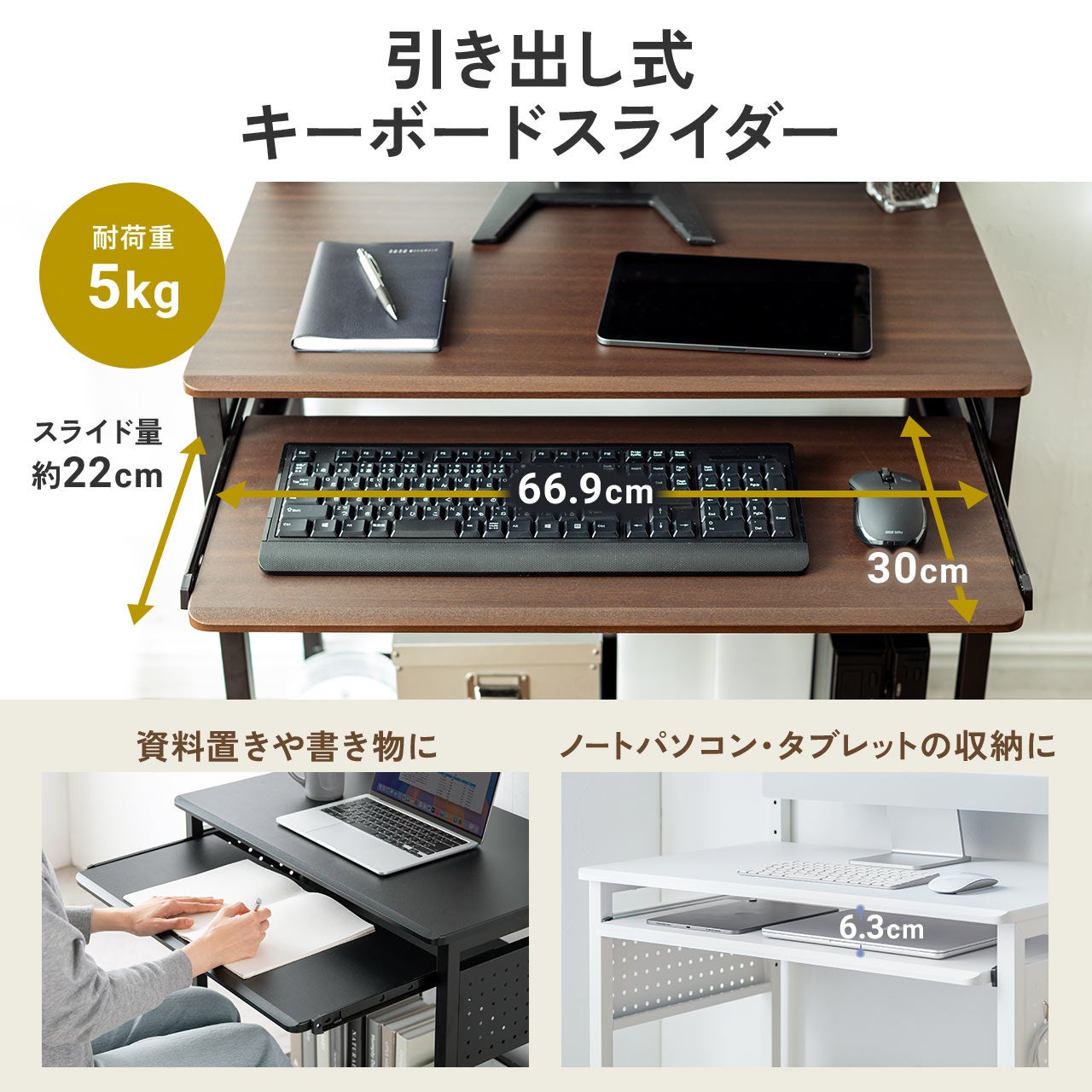 幅75cm パソコンデスク キーボードスライダー 木目調 ブラウン 有孔ボード コンパクト 収納棚付 棚組み替え キャスター付 サブテーブル付