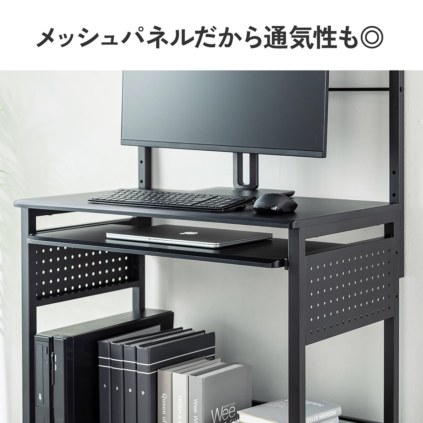 サイドの有孔ボードと組み替え可能な4WAY棚板に上棚と奥行きのある天板など収納力は抜群です。上棚の高さはモニターサイズに合わせて変更可能なため、様々なモニターに対応します。