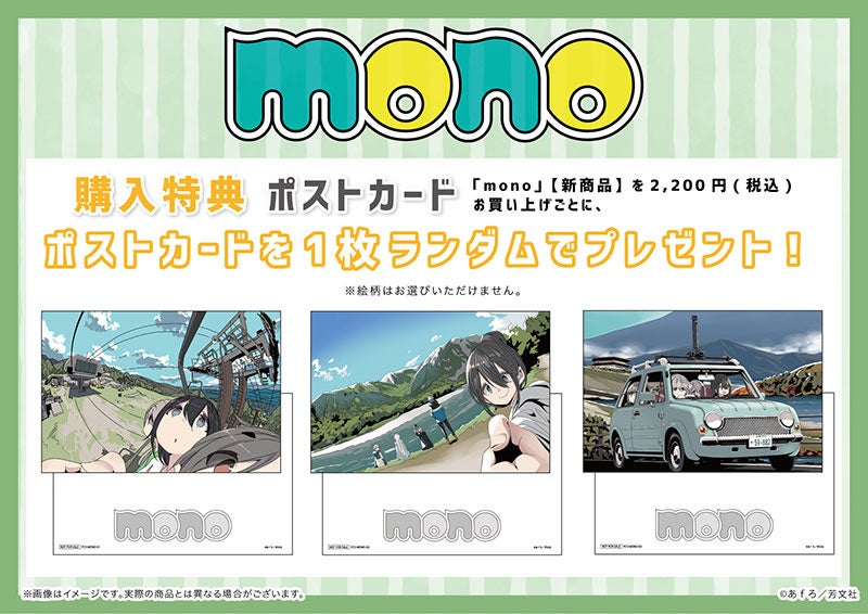 期間中、ゲーマーズオンラインショップにて『mono』【新商品】を2,200円(税込)お買い上げごとに、特典ポストカード(全3種)をランダムで1枚プレゼント!