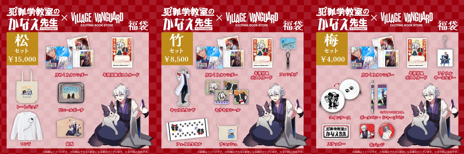 2023年12月26日(火)より、【犯罪学教室のかなえ先生×ヴィレッジヴァンガード】コラボ福袋発売決定!!今年1月に大好評だったかなえ先生とのコラボグッズが、今度は福袋で登場!松・竹・梅、どれもかなり豪華なラインナップとなっております!