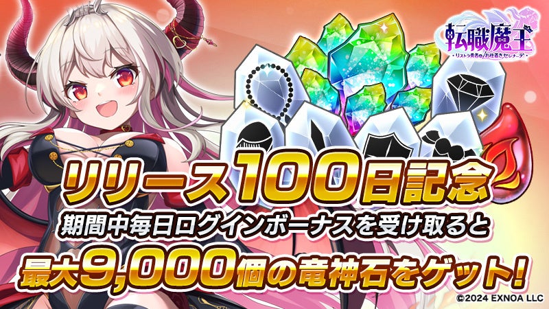 リリース100日を迎えたDMM GAMES『転職魔王~リストラ勇者のお仕置きセレナーデ~』にて記念キャンペーンを開催!ログインボーナスで最大9,000個の「竜神石」やキャラクター「リタ」がもらえる!