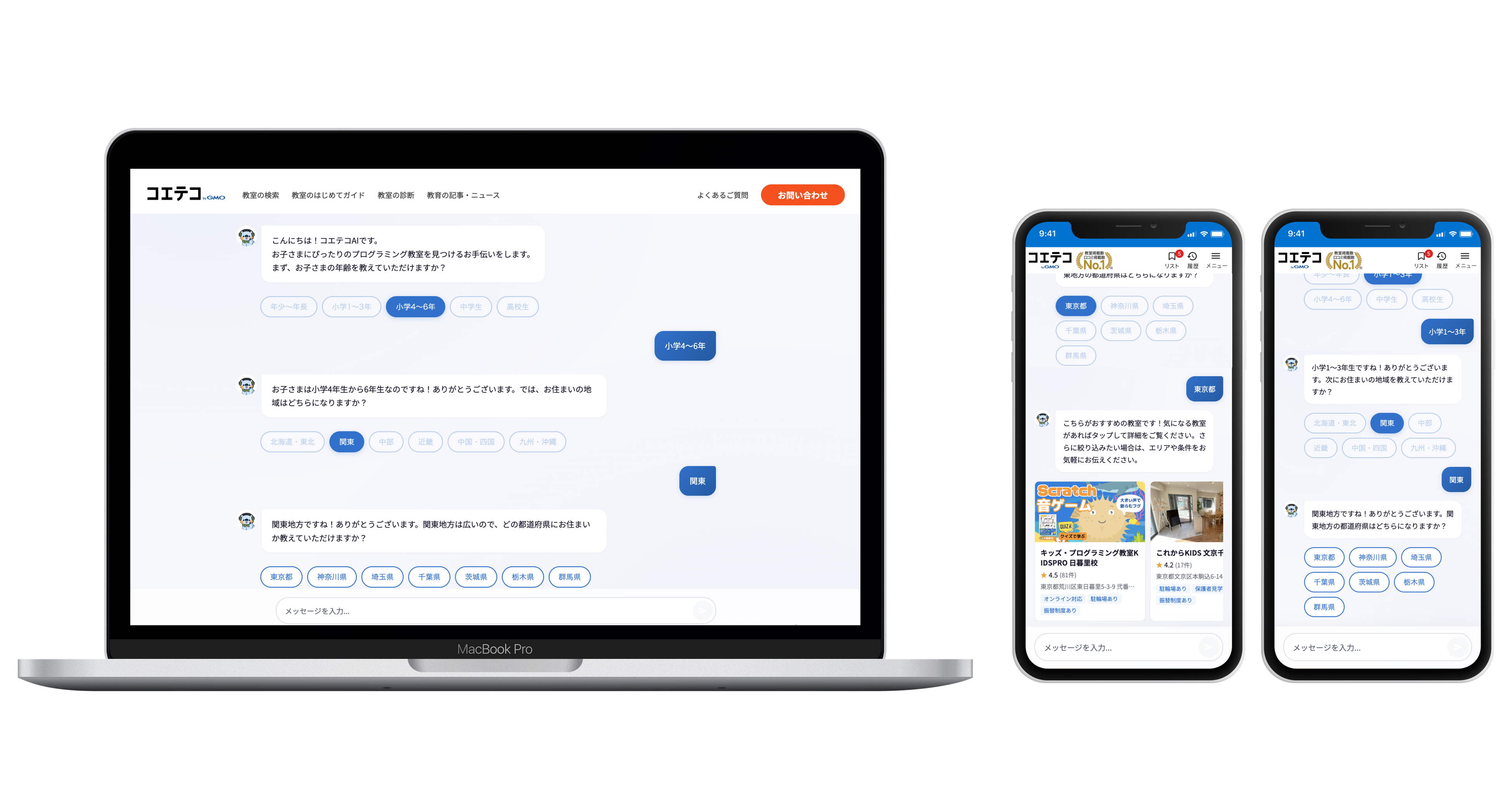 「何歳の子どもに向いているか」「ゲームが好きでも問題ないか」「通学とオンラインのどちらが良いか」といった曖昧な相談から始められます。AIが対話を通じて希望を整理します。