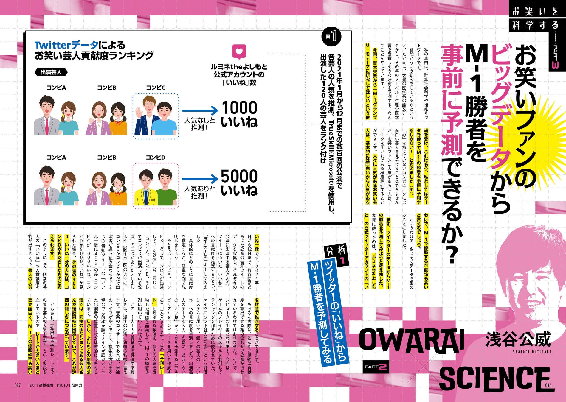 東大の先生と吉本の芸人という異例のコラボが生み出す特集記事の中には「ファンのビッグデータからM-1勝者を予測できるか?」「芸人のSNSアカウント相関図から『売れる芸人の戦略』がわかるか?」といった興味深い研究から、石田明(NON STYLE)、野田クリスタル(マヂカルラブリー)、哲夫(笑い飯)といった、「お笑いを構造的に語れる」芸人が漫才や笑いの本質についてじっくりと語るものまで読みどころ満載。各芸人のグラビアもじっくり撮影しており、判型がA4と大型なので、ファンにとってはちょっとした写真集でもあります。