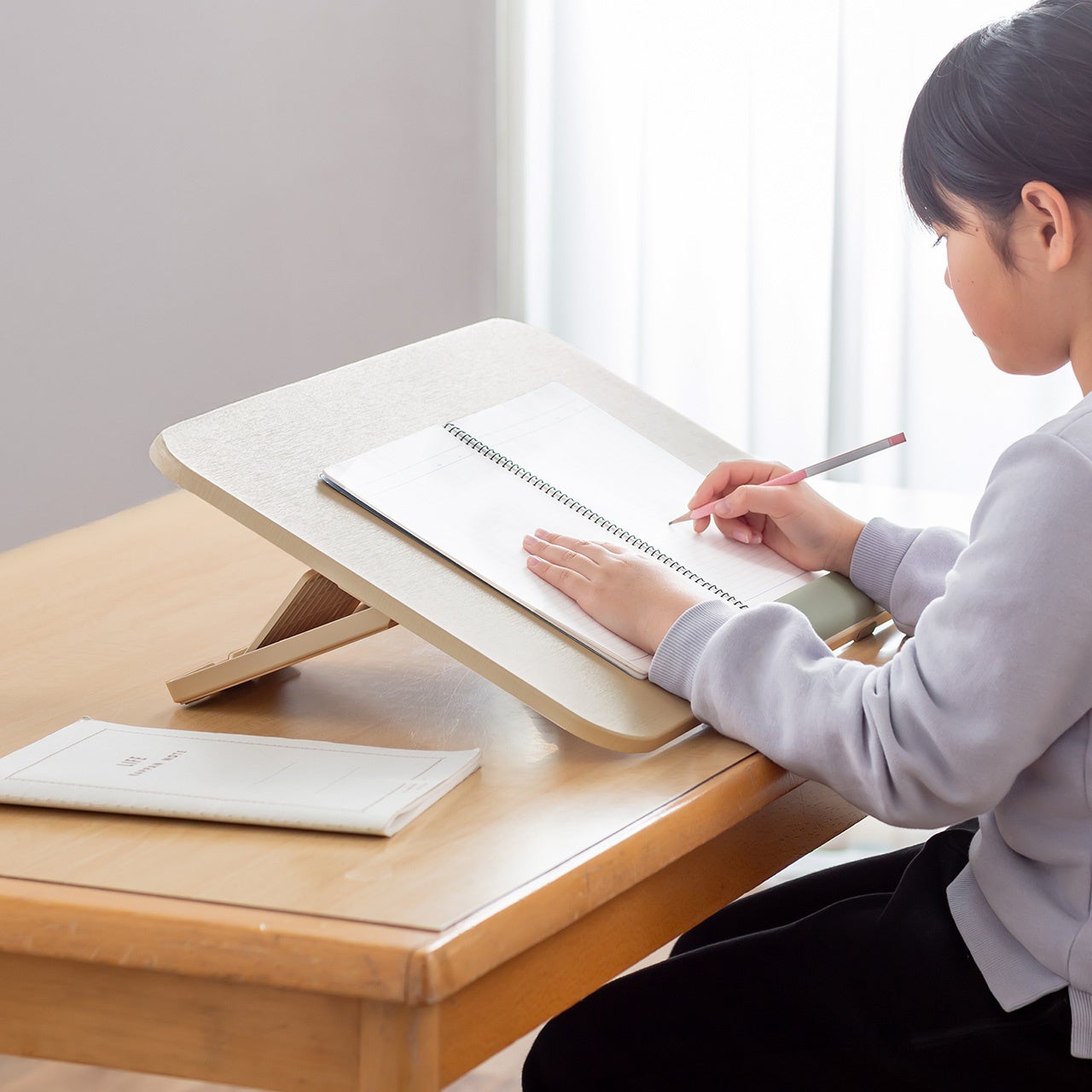 学習机やダイニングテーブル、リビングテーブルなどに置いて使うことで学習時の姿勢を改善し、体への負担の軽減と学習環境を整えます。