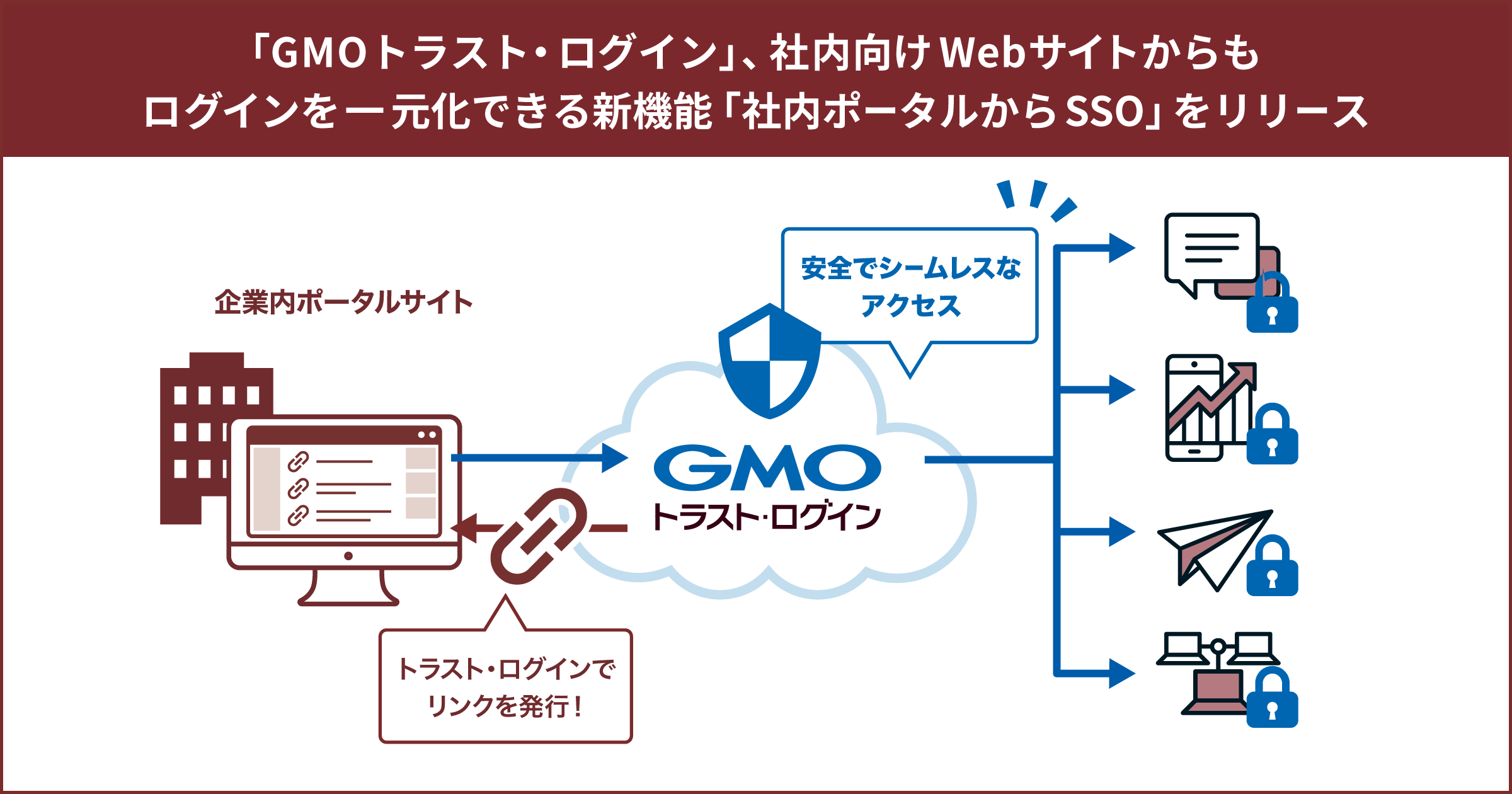 GMOインターネットグループのGMOグローバルサイン株式会社(※1)(代表取締役社長:中條 一郎 以下、GMOグローバルサイン)が提供するID管理・認証サービス「GMOトラスト・ログイン」は、企業の社内向けWebサイトなどから直接シングルサインオン(SSO)を実行できる新機能「社内ポータルからSSO」を、2026年2月27日(金)にリリースしました。