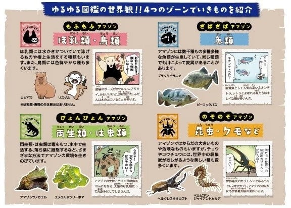 「ゆるゆる図鑑アマゾン展」では『ゆるゆるアマゾン図鑑』の世界観の元、「もふもふアマゾン」ではほ乳類・鳥類、「ざばざばアマゾン」では魚類、「ぴょんぴょんアマゾン」では両生類・は虫類、「のそのそアマゾン」では昆虫・クモなどを4つのゾーンにわけて紹介。またピーコックバスやエメラルドツリーボア、ヘルクレスオオカブトなどのアマゾンに生息する生物22~25種類を展示し、普段は目にすることのできない生物を観察できる貴重な体験をご提供いたします。